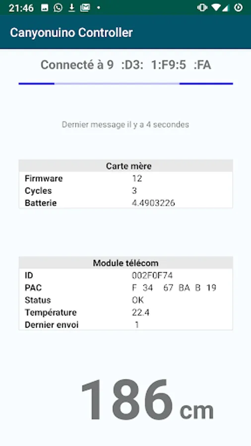 Connect via Bluetooth to a Canyonnuino module and follow in real time the measurements made as well as the various life parameters of your connected level sensor.