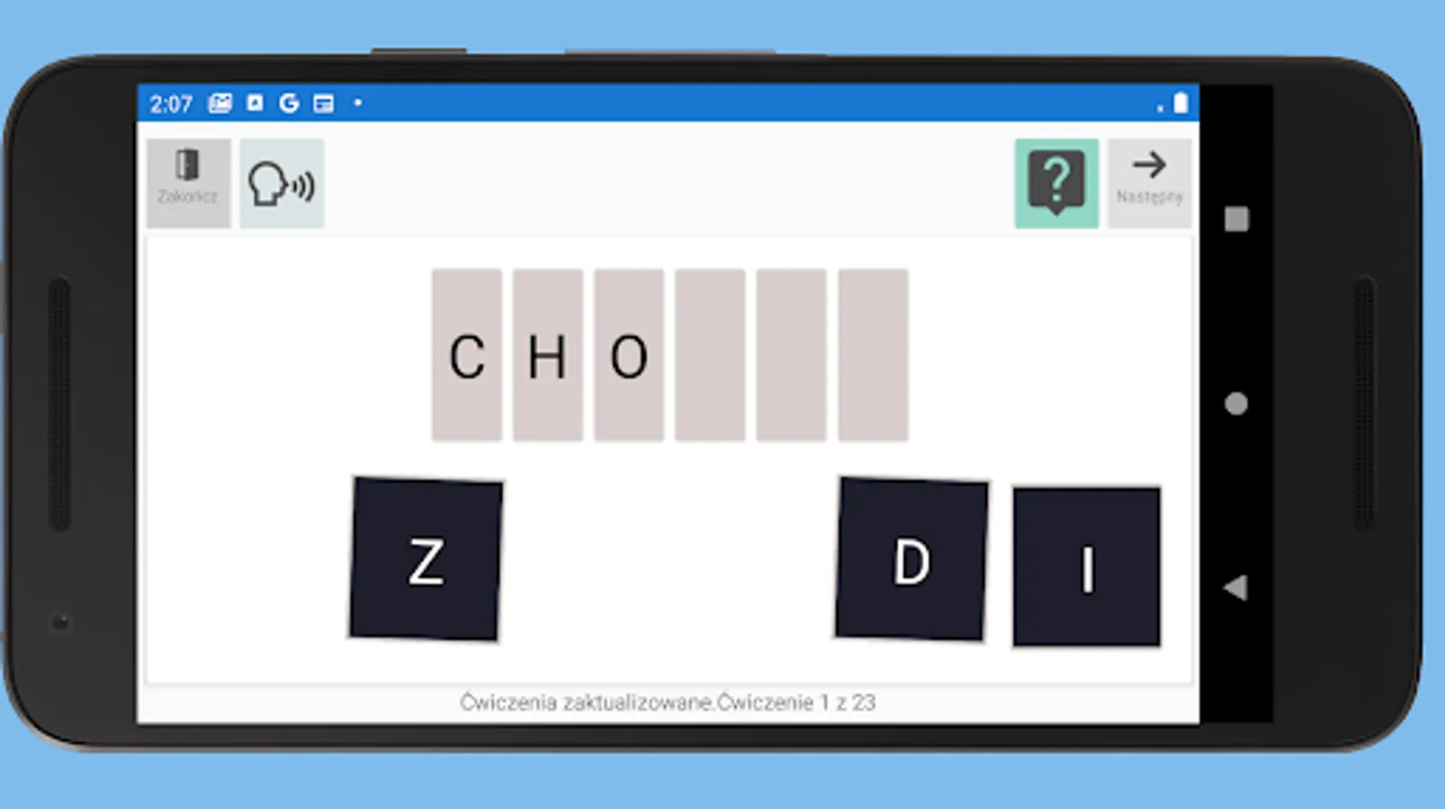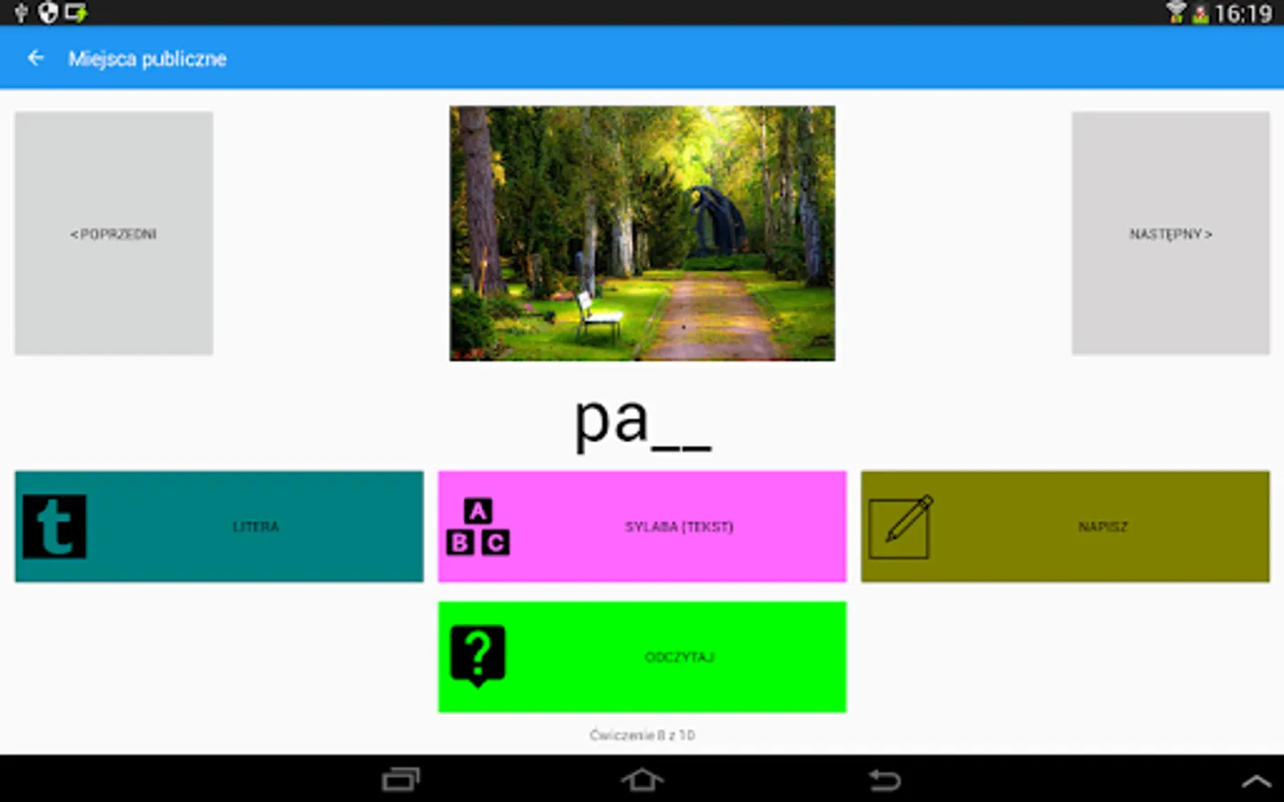 The application after downloading and installing a set of exercises works without access to the Internet. Replacing paper books and notebooks, and additionally includes an interactive sound, signaling the patient to correct answers.