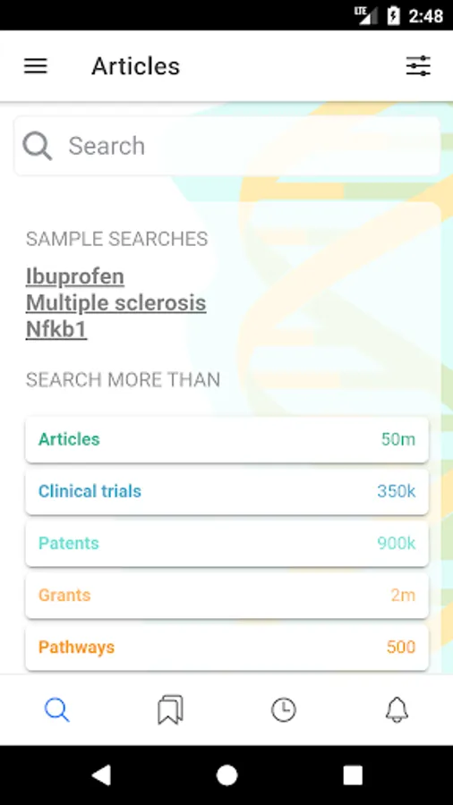 BioSeek Mobile helps you find and gives you access* to the most important science-related databases like PubMed, PMC ( PubMed Central ), and Medline, and more data from the National Center for Biotechnology Information ( NCBI ) at the U.S. National Library of Medicine ( NLM ), located at the National Institutes of Health ( NIH ), at one spot. Search more than 50 million articles, more than 300 k clinical trials, more than 2 million grants, more than 5 million patents, etc.