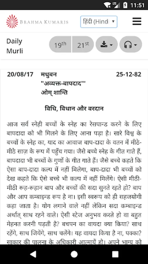 This app provides the murlis in html, pdf and audio and daily murlis are available in 28 languages.