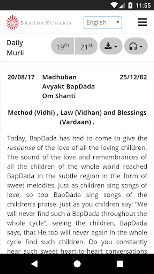Welcome to the Official Mobile App, for reading or listening to your daily murlis, provided by the Brahma Kumaris.