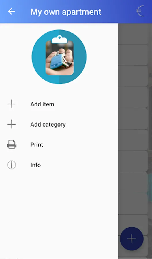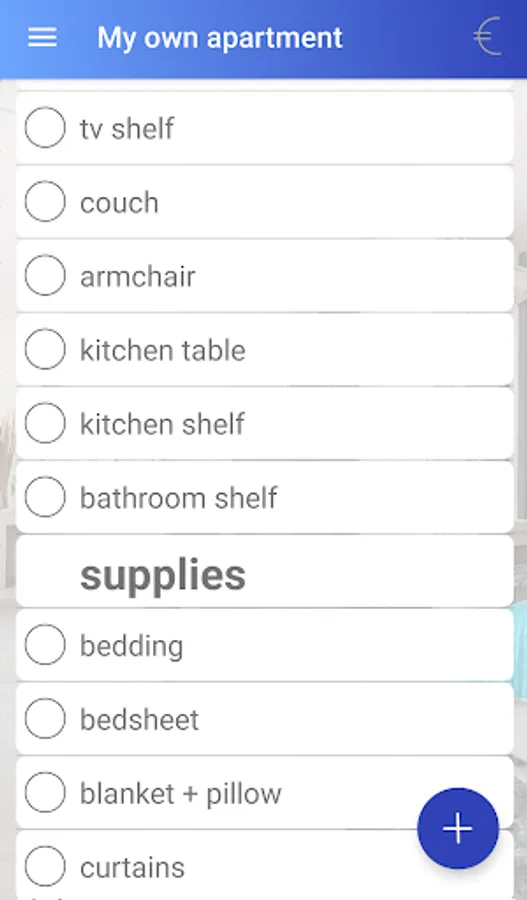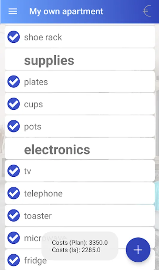 A predifined checklist shows you all the furniture, electronic devices etc. you will need in your own apartment. And you can complete this list with your own stuff and categories.