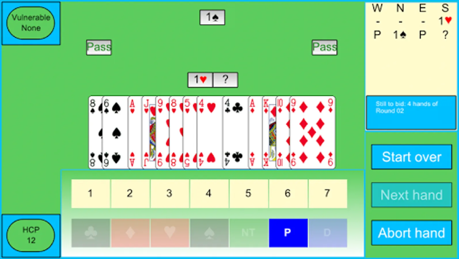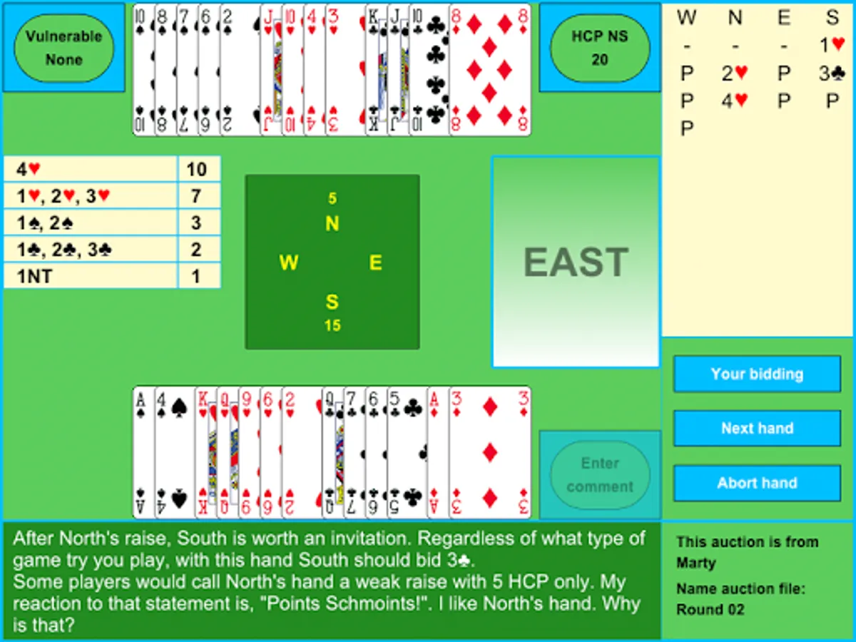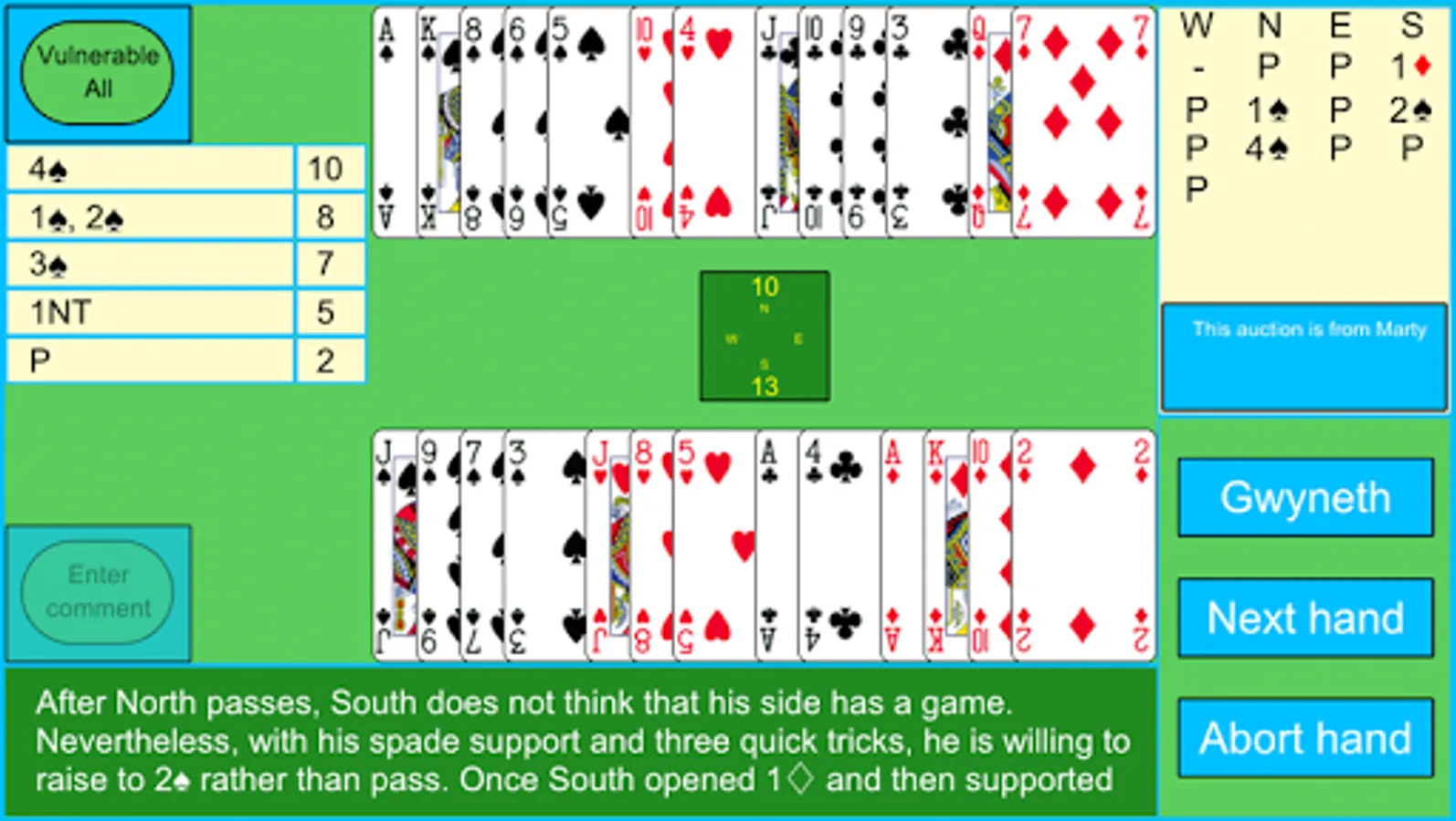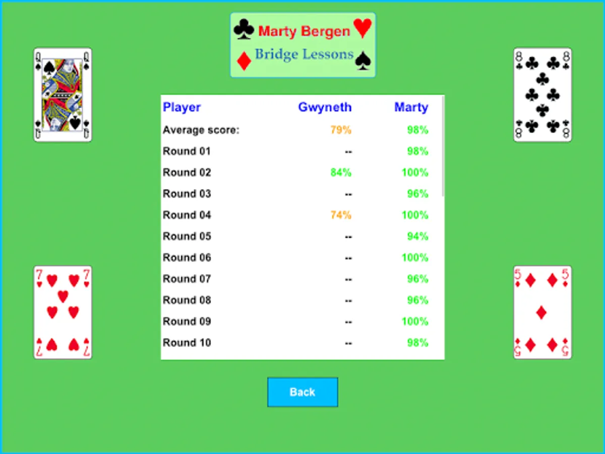 After you finish an auction, you will see a table with the possible contracts and the score for each contract (from 0 to 10). You will also see Marty's suggested auction, and most importantly, his evaluation of the hands and recommendations on the best way to handle them. All your auctions and scores are saved and can be viewed later.