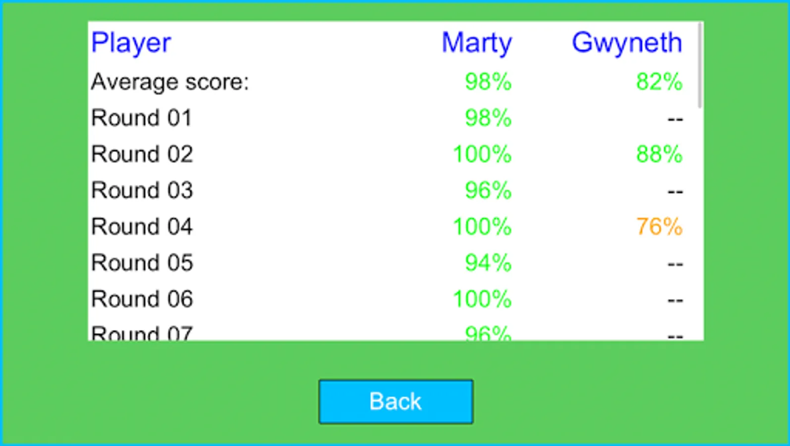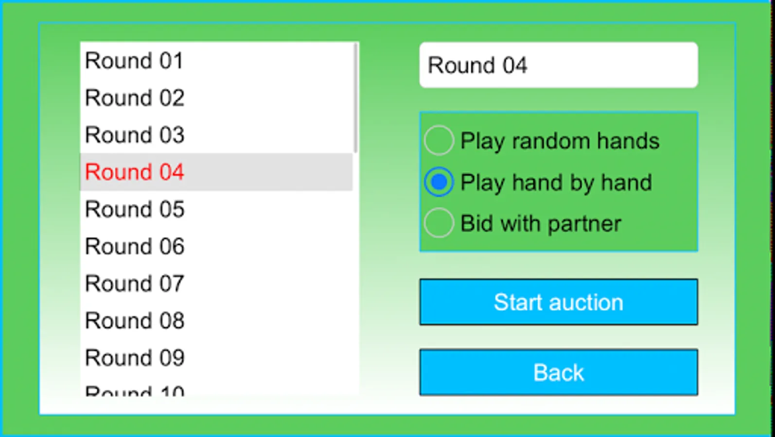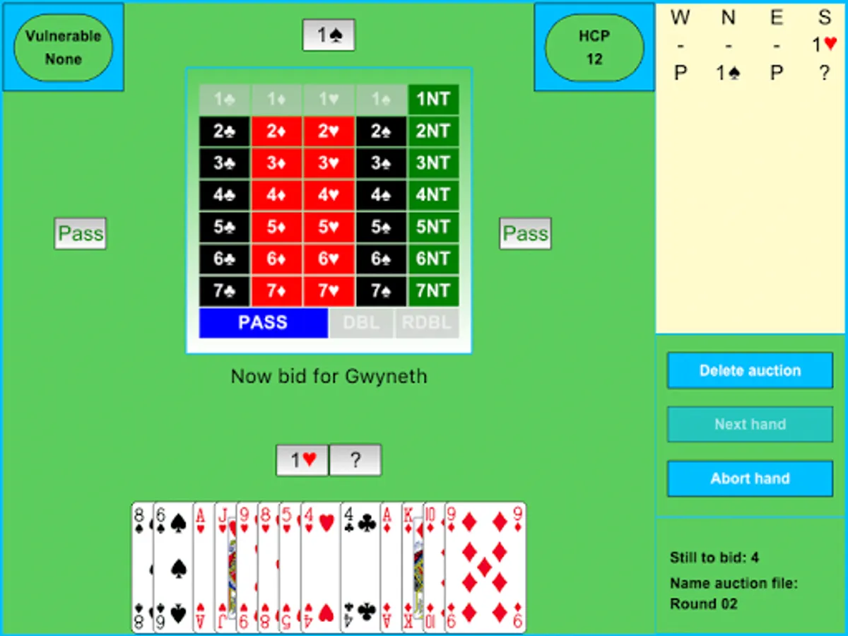After you finish an auction, you will see a table with the possible contracts and the score for each contract (from 0 to 10). You will also see Marty's suggested auction, and most importantly, his evaluation of the hands and recommendations on the best way to handle them. All your auctions and scores are saved and can be viewed later.