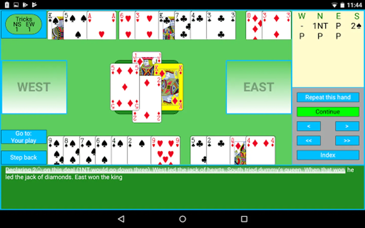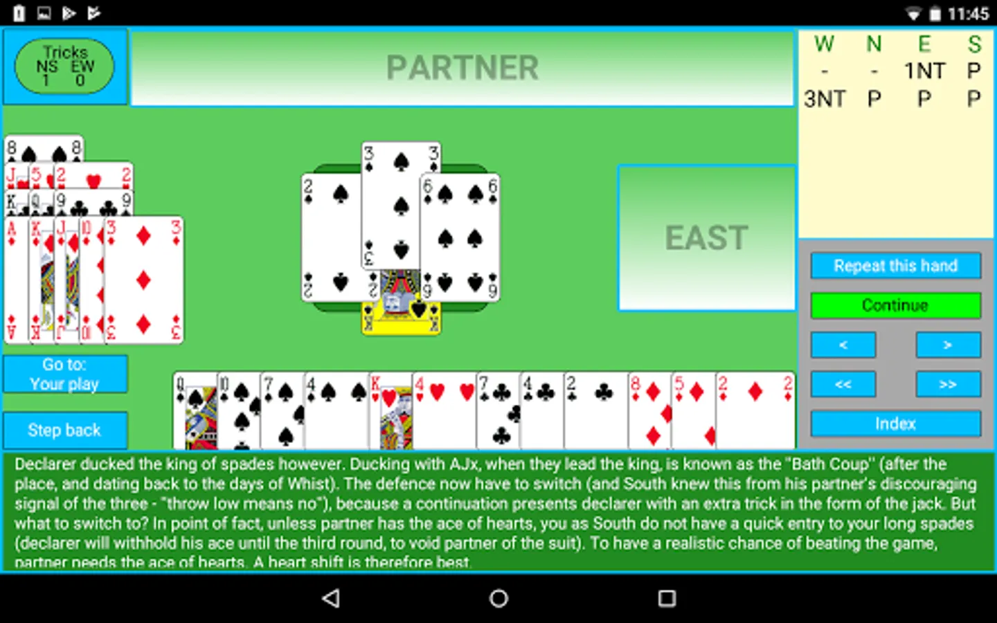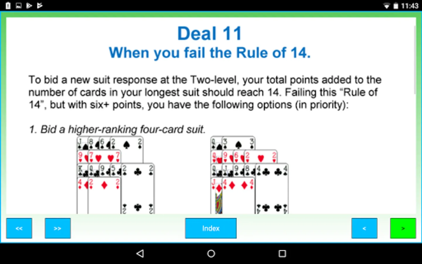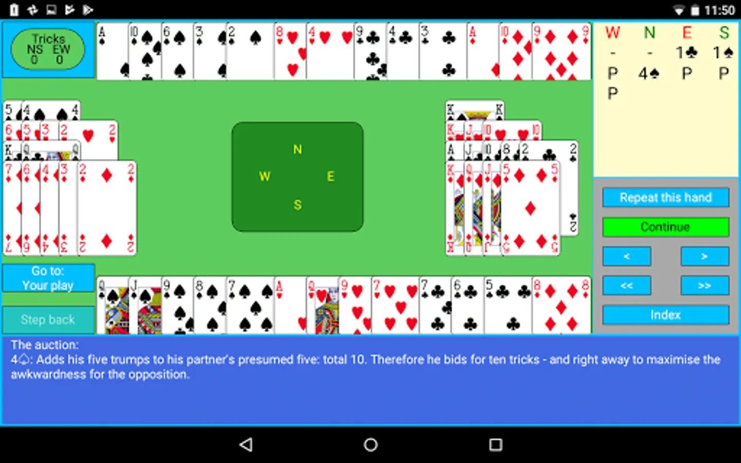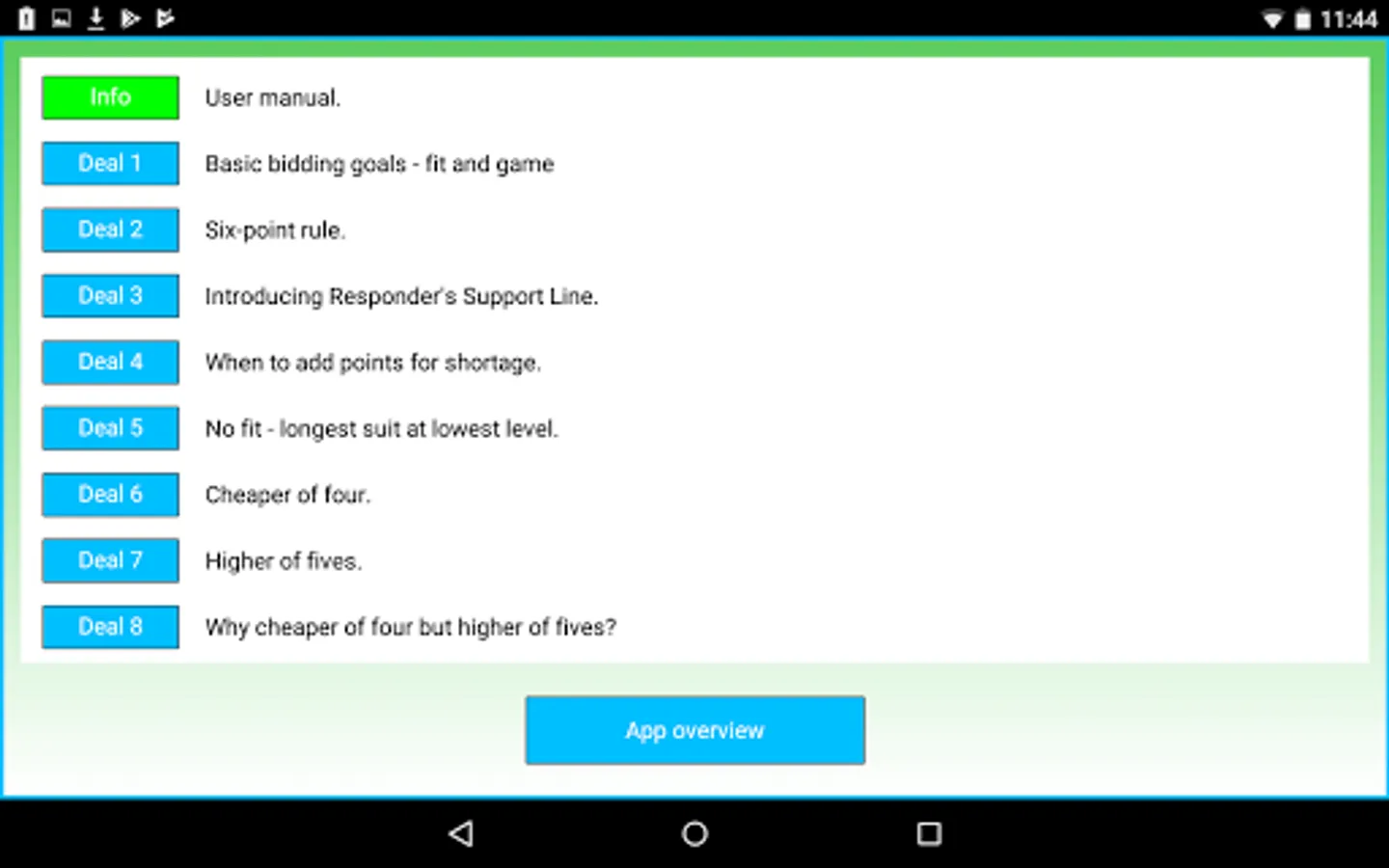 In an interactive way, you learn the theory behind each topic (Bidding as Opener, Responder and FSF, Overcall, Opening Lead, Finesse), often doing some interactive quizzes. Complete deals, which you have a change to play, are then played and explained by Andrew.