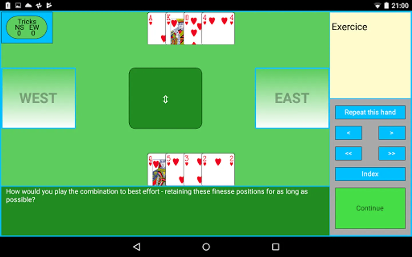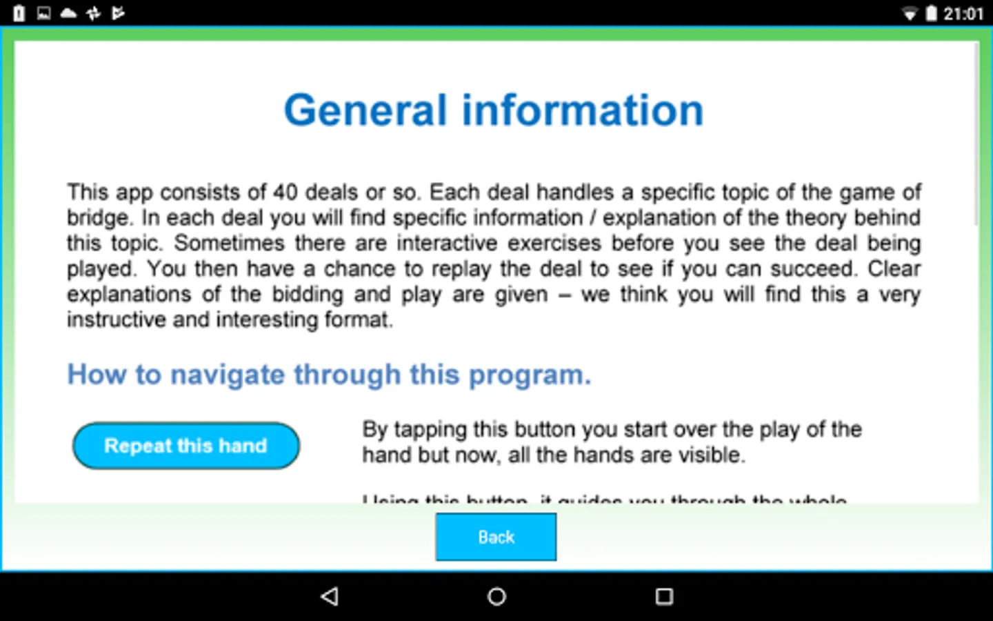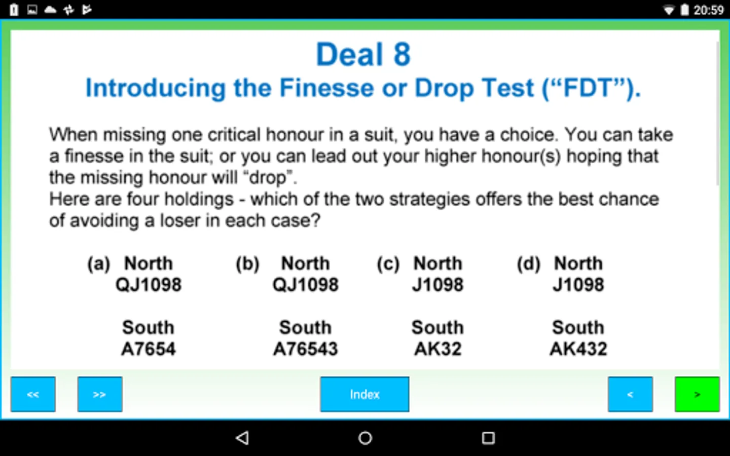 In an interactive way, you learn the theory behind each topic (Double, Defence, Signal and Discard, Stayman and Transfer, Rules, Acronyms and Ditties), often doing some interactive quizzes. Complete deals, which you have a change to play, are then played and explained by Andrew.