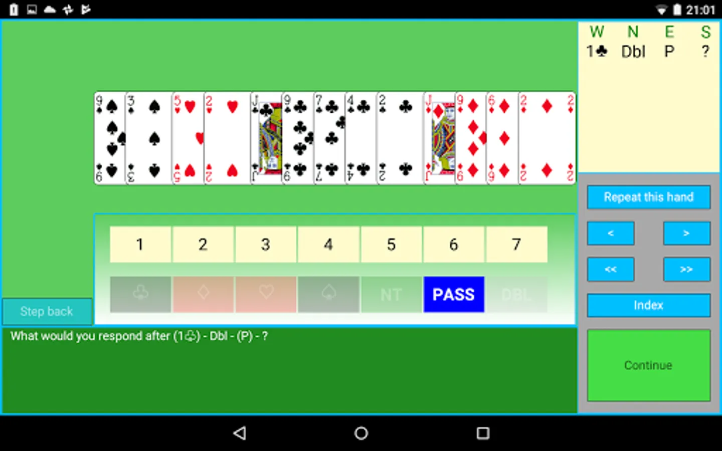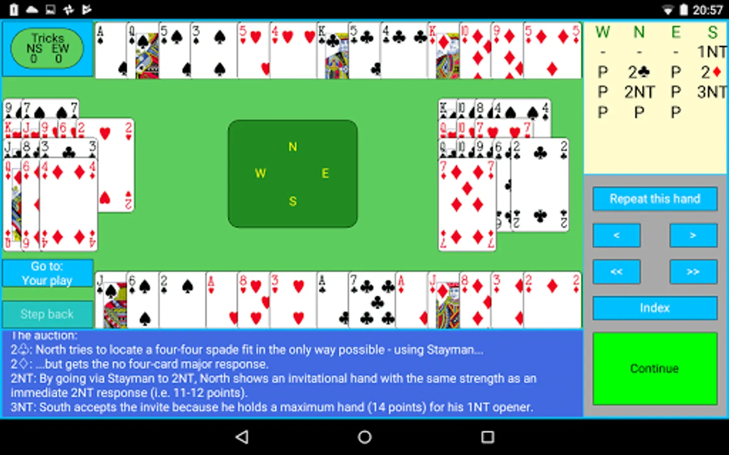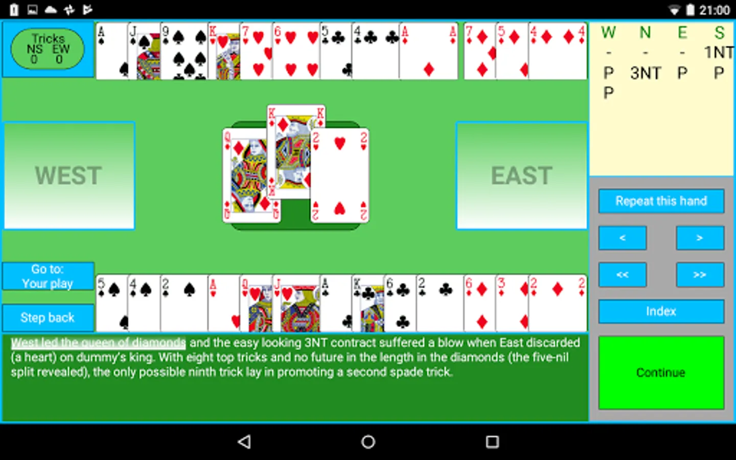 In an interactive way, you learn the theory behind each topic (Double, Defence, Signal and Discard, Stayman and Transfer, Rules, Acronyms and Ditties), often doing some interactive quizzes. Complete deals, which you have a change to play, are then played and explained by Andrew.