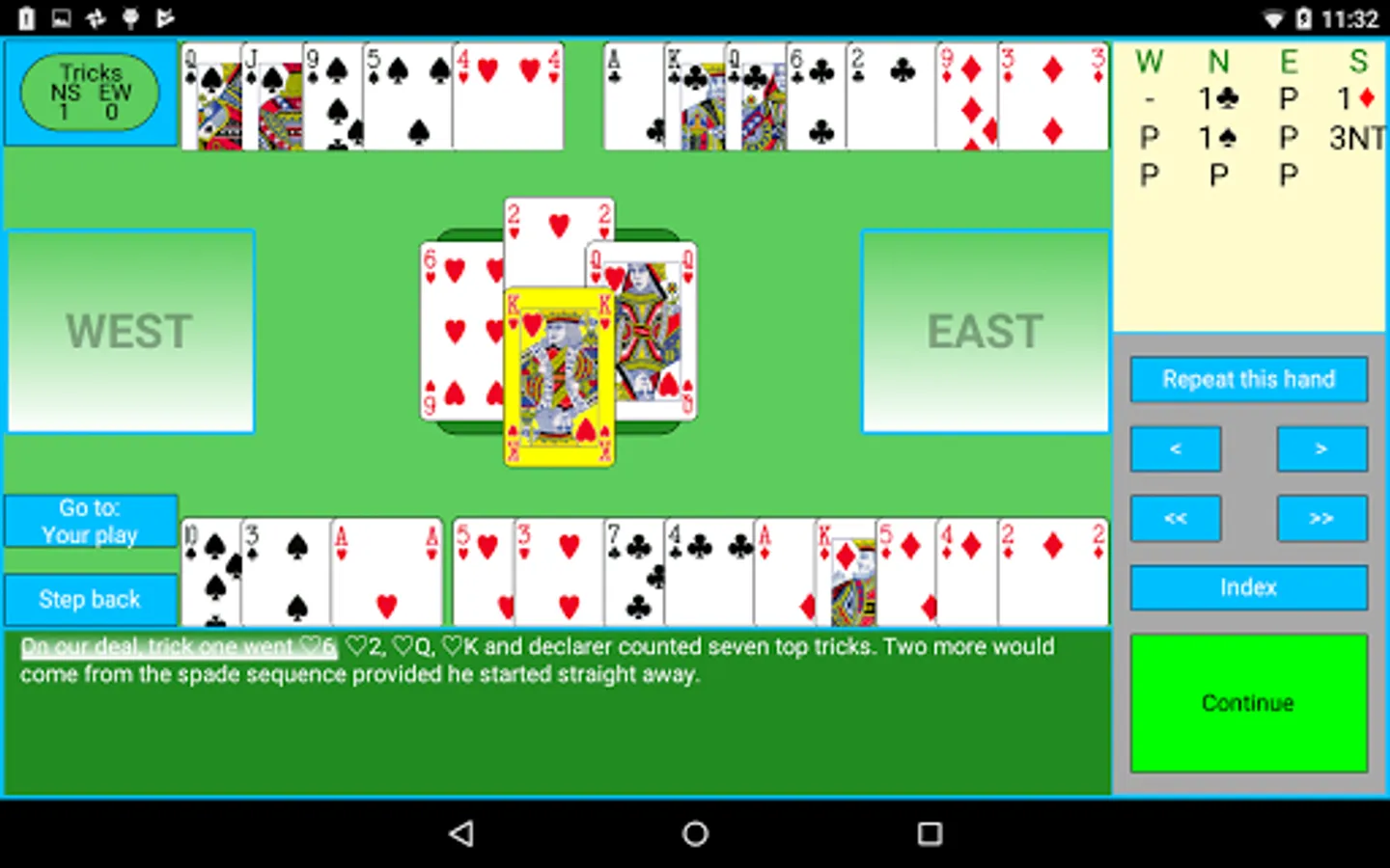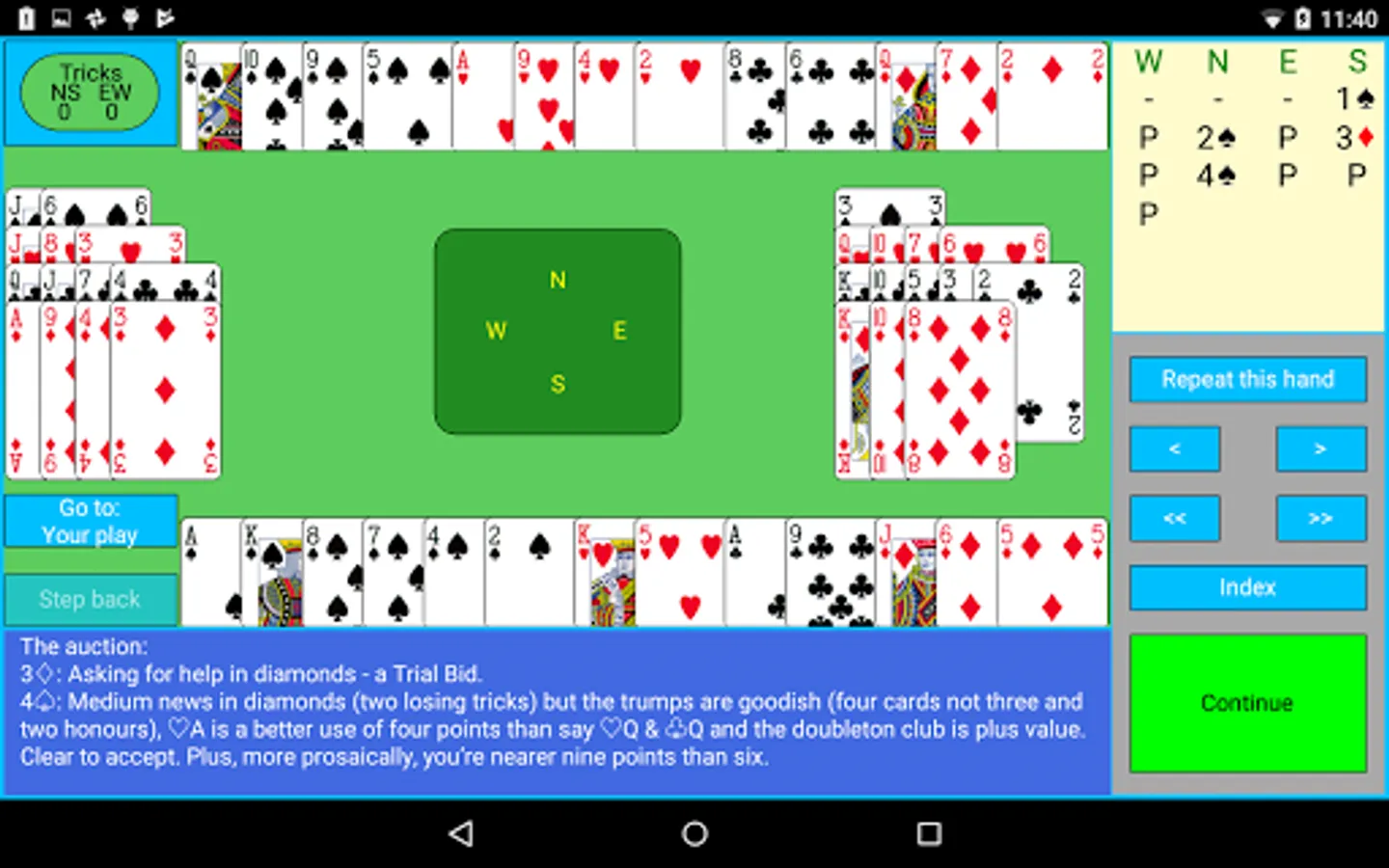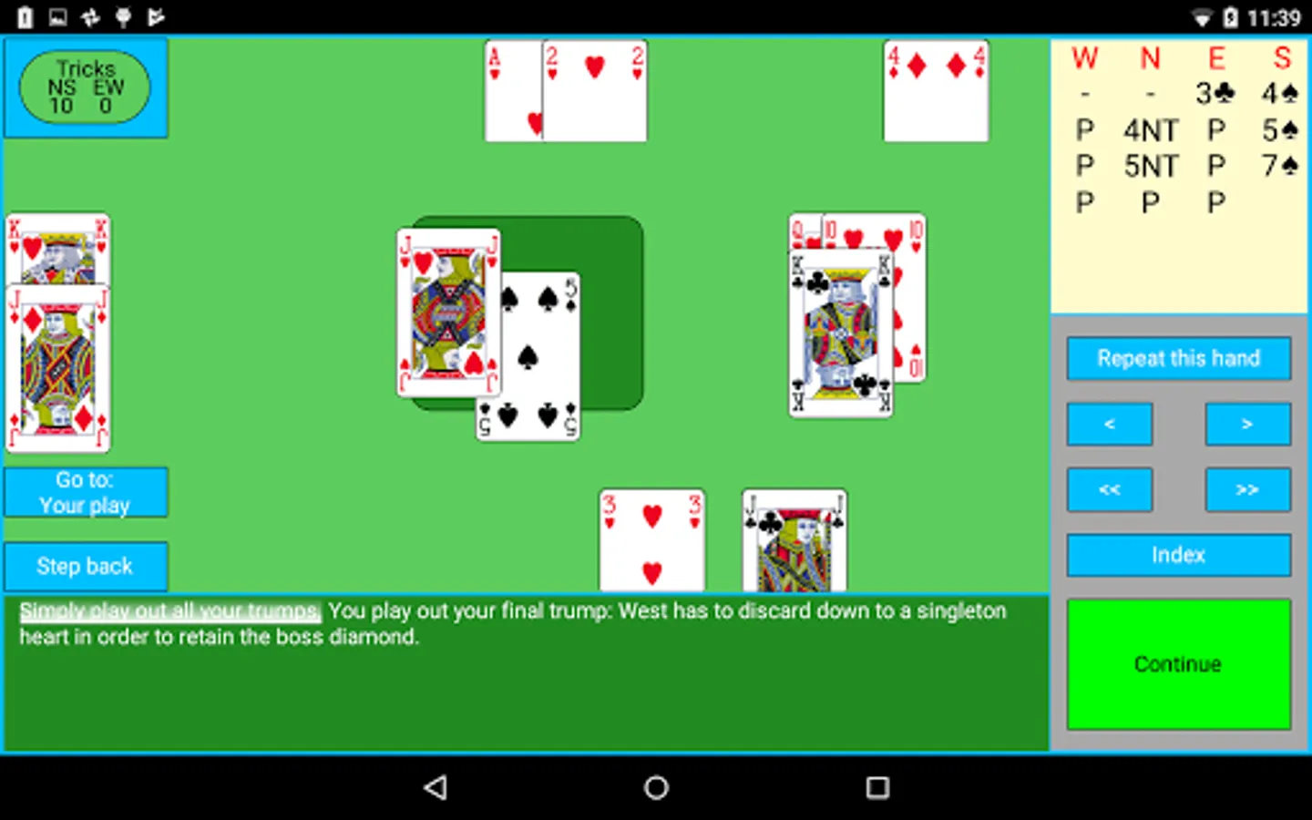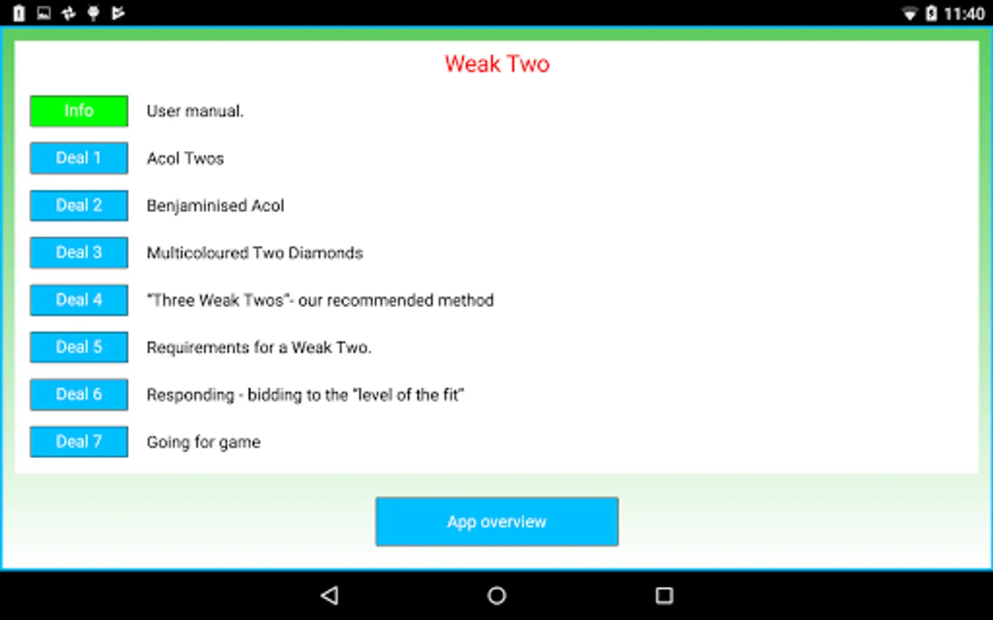 In an interactive way, you learn the theory behind each topic (Decaring Notrump Contracts, Declaring Trump Contracts, Weak Two, Slam, Hand Evaluation and the LTC), often doing some interactive quizzes. Complete deals, which you have a change to play, are then played and explained by Andrew.