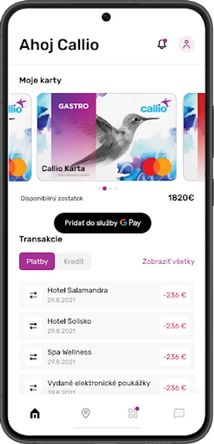Download the CALLIO application and you will get a simple overview of the current balance and movements on your Callio multifunction card, the network of acceptance points and also current partner events.