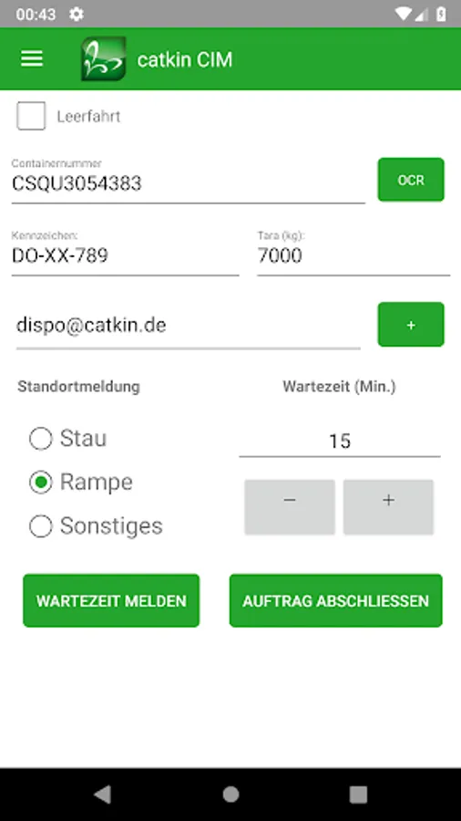 Simply report delays in container transport by truck! Forward container status and traffic jam reports to the dispatcher with 3 clicks. Capture of the completed waybills by photo.