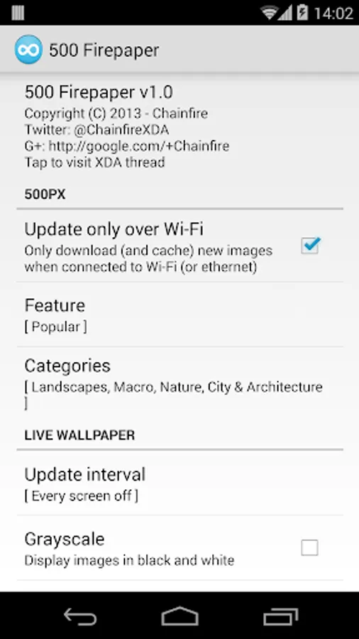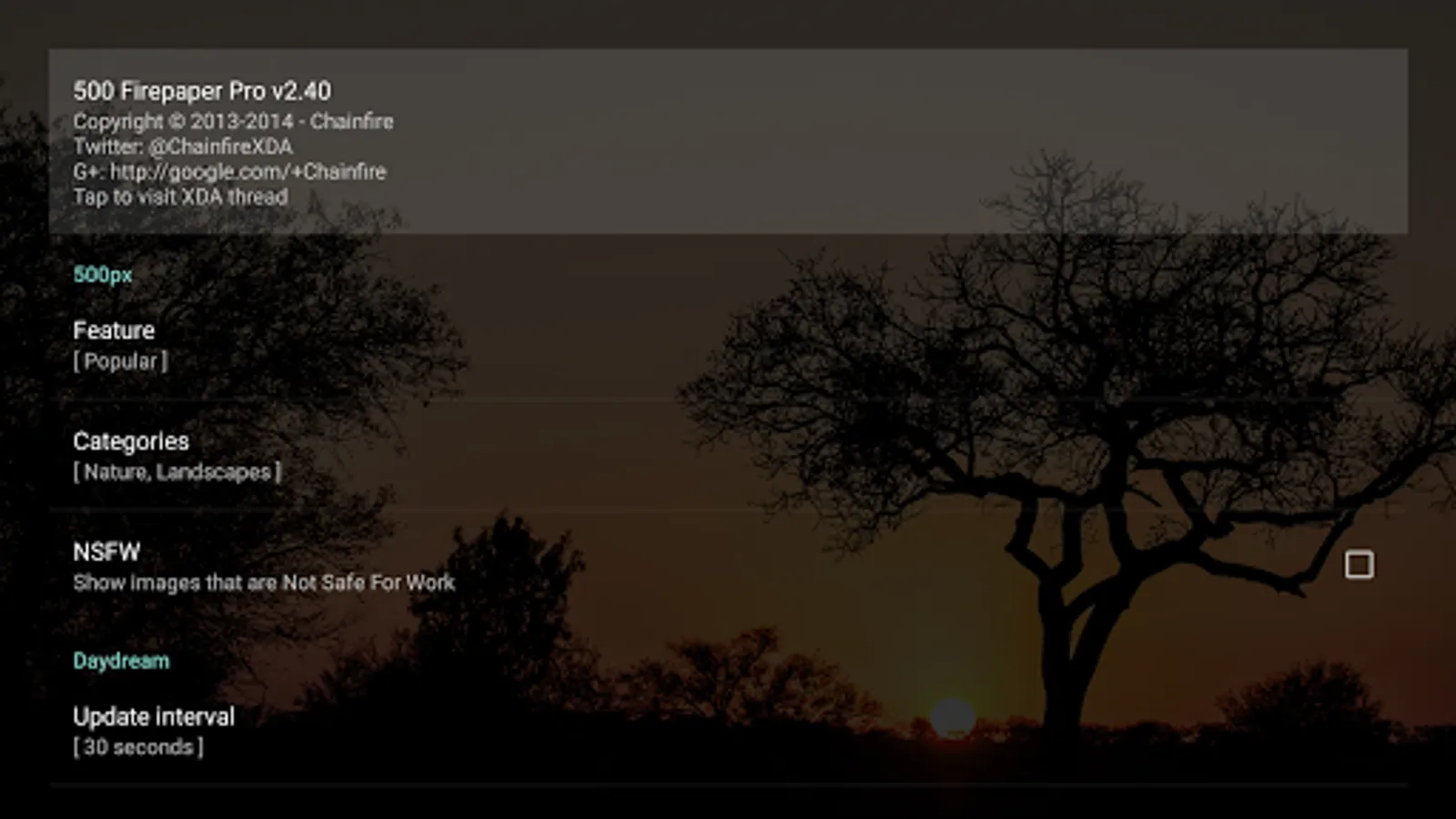 NOTICE: This app switched from using the 500px API to showing images from Reddit's /r/EarthPorn sub, as 500px is shutting down their API. Please read the statement on my G+ page - https://plus.google.com/+Chainfire/posts/W52tb4kp8zN