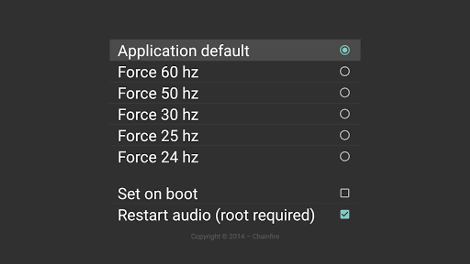 - Switching hz may break audio. This app provides an option to fix that, but that does require your device to be rooted. Note that this may be both Android TV device as well TV dependent - your setup may not display this issue.