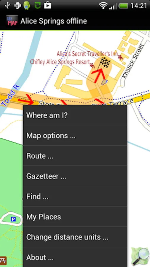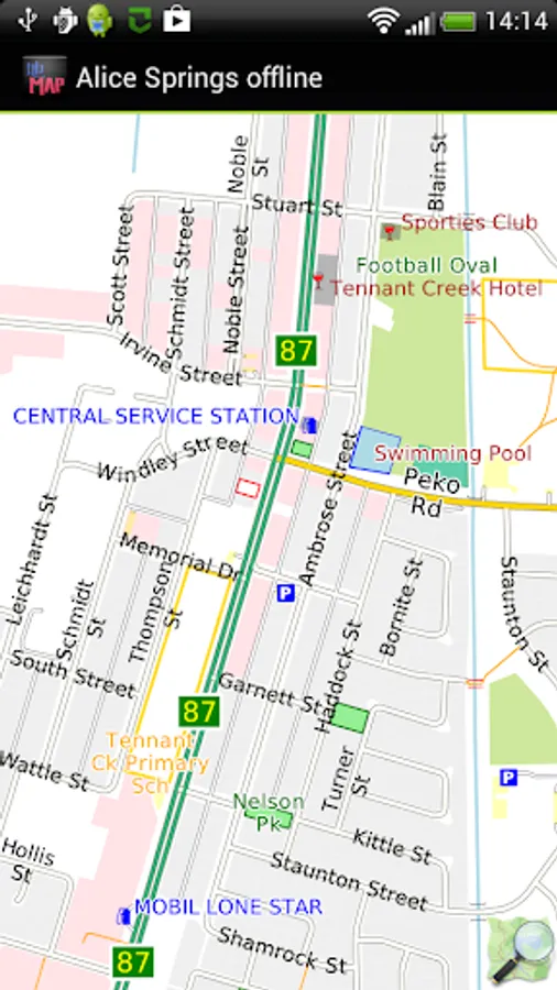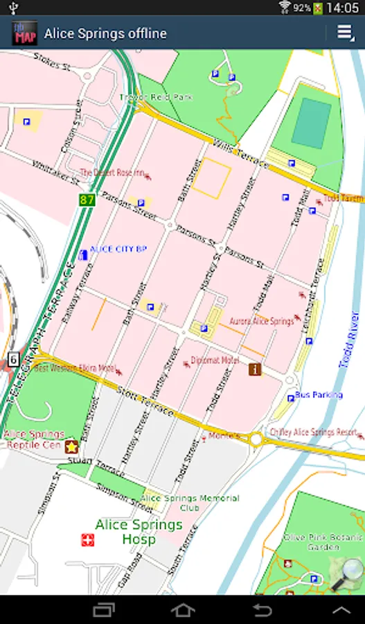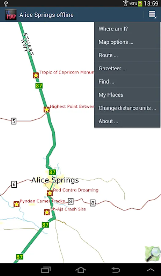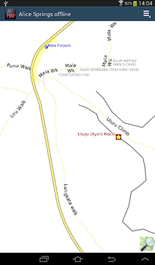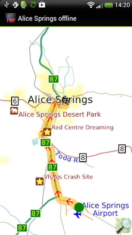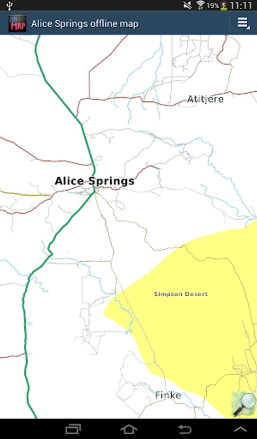 Offline map of Alice Springs and Uluru/Ayers Rock, Australia with the southern half of the Northern Territory for tourist & business visitors. Download before you go and avoid expensive roaming charges. The map runs completely on your device; display with pan and zoom, routing, search, bookmark, everything. It does not use your data connection at all. Switch your phone function off if you want to!