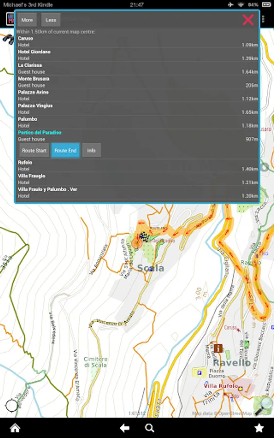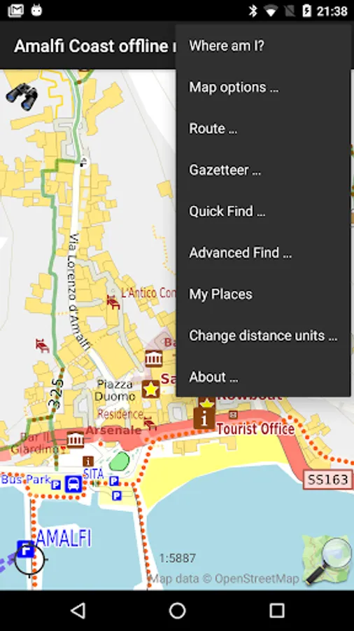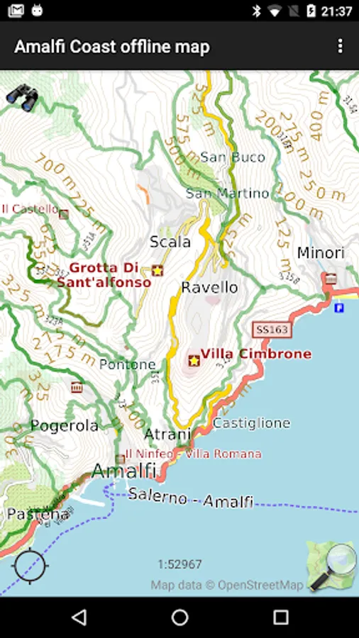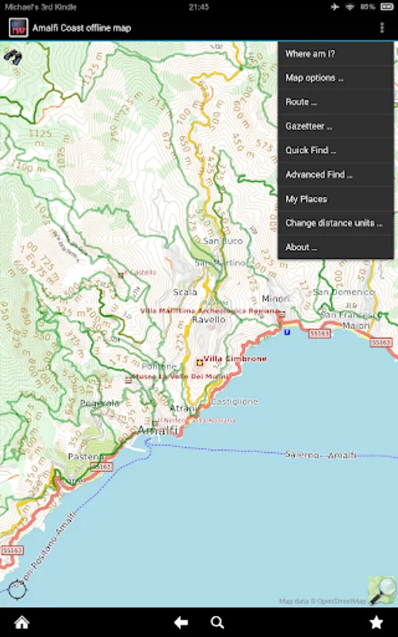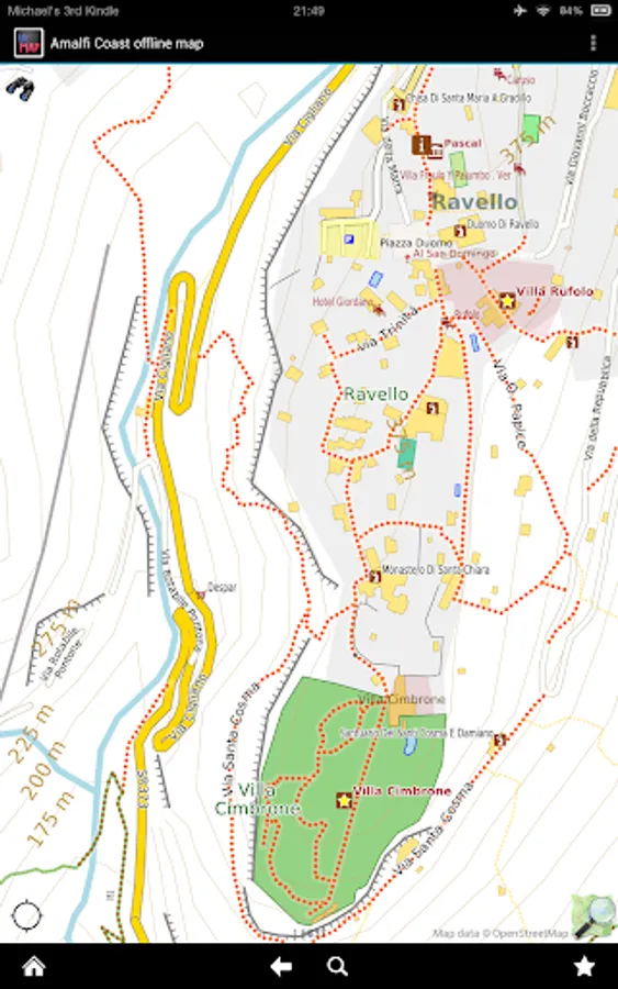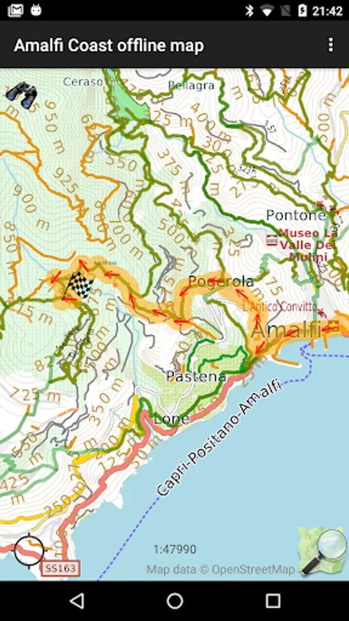 Offline tourist map of the Amalfi coastline of Italy. Avoid expensive roaming charges. The map runs completely on your device; map, routing, search, bookmark, everything. It does not use your data connection at all.