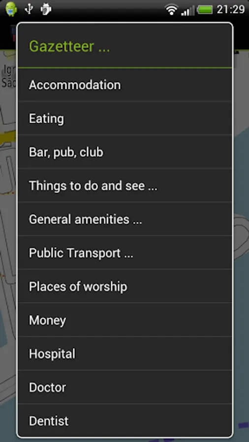 The app includes a search function and a gazetteer of commonly needed items like hotels and eating places.