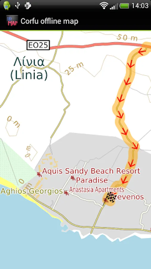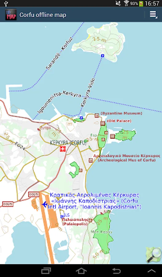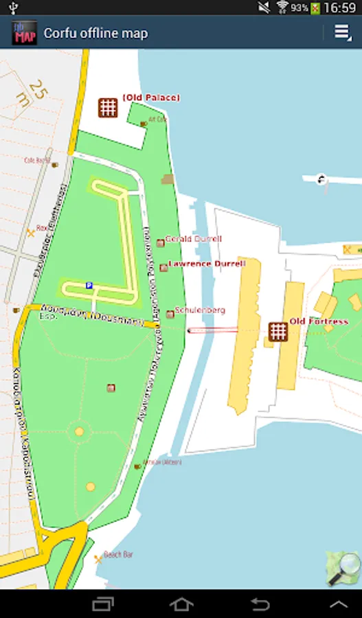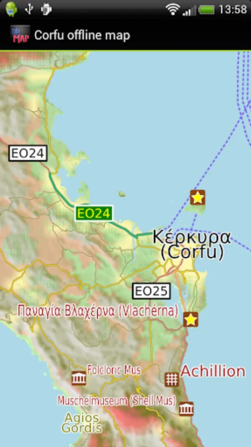 Offline map of Corfu island, Greece for tourist and business visitors. Download the app before you go or using your hotel's Wi-Fi and avoid expensive roaming charges. The map runs completely on your device; map, routing, searching, everything. It does not use your data connection at all. Switch your phone function off if you want to. NSA proof!
