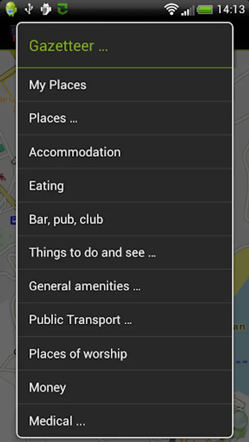 The app includes a search function and a gazetteer of commonly needed items like hotels, eating places, shops, banks, things to see and do, golf courses, medical facilities.