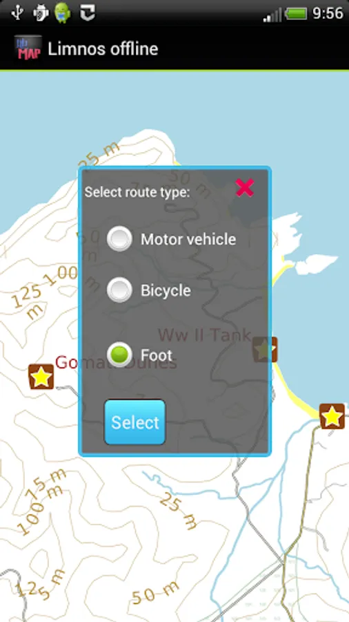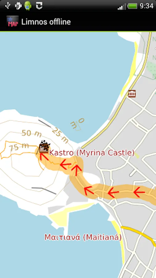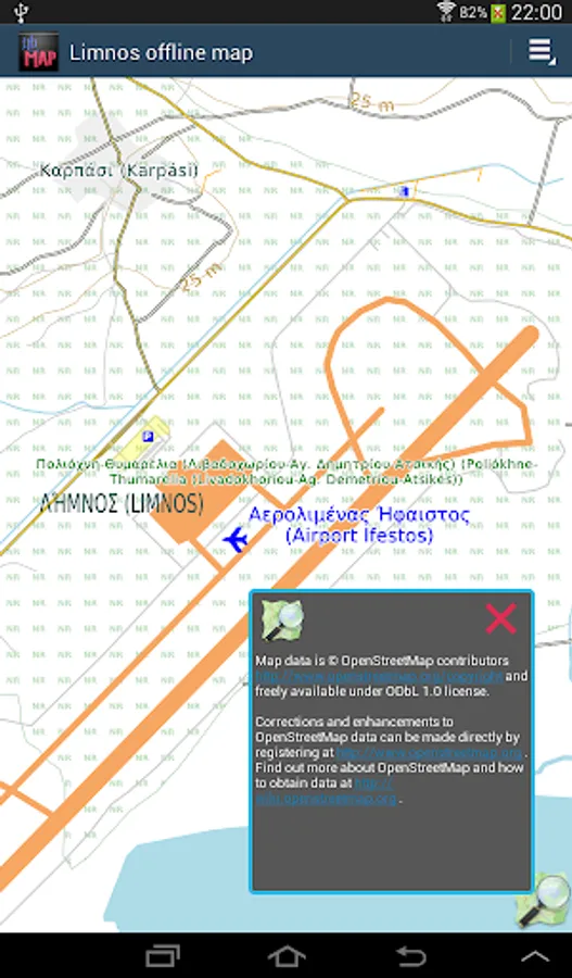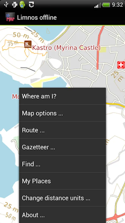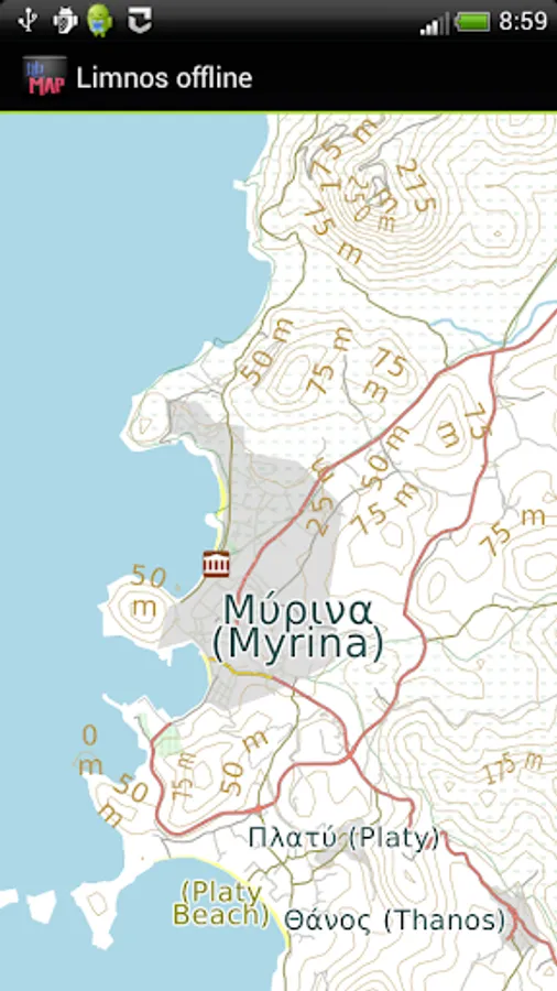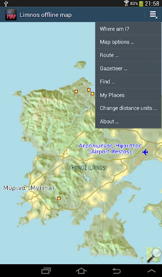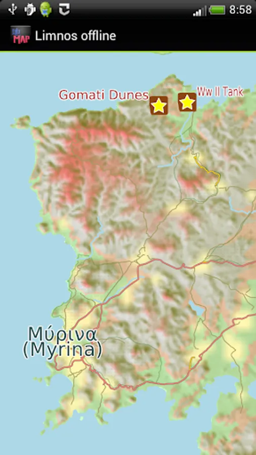 Offline map of the Greek island of Lemnos/Limnos for tourist and business visitors. Download the app before you go or using your hotel's Wi-Fi and avoid expensive roaming charges. The map runs completely on your device; map display, routing, searching, everything. It does not use your data connection at all. Switch your phone function off if you want to.