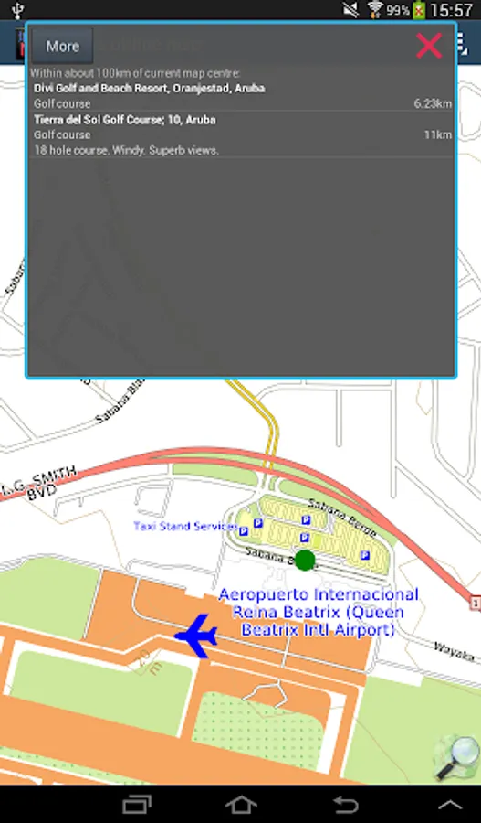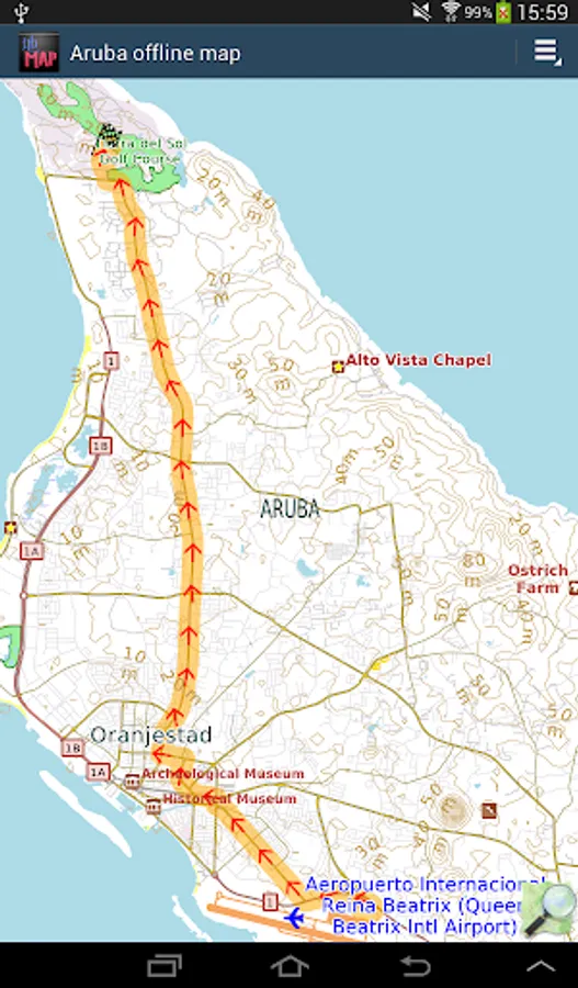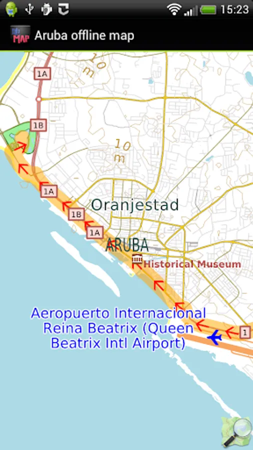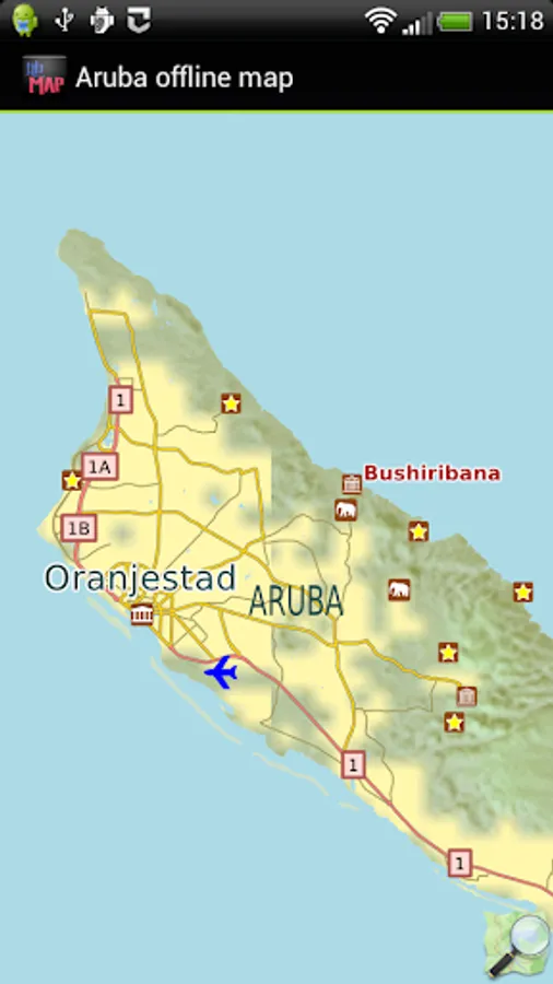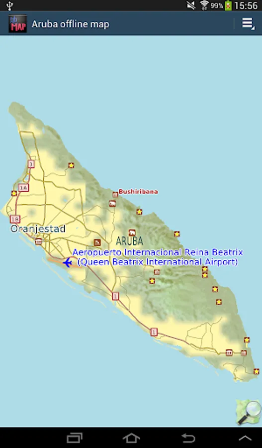 Offline map of the Caribbean resort island of Aruba for tourist & business visitors. Download before you go and avoid expensive roaming charges. The map runs completely on your device; display with pan and zoom, routing, search, bookmark, everything. It does not use your data connection at all. Switch your phone function off if you want to!