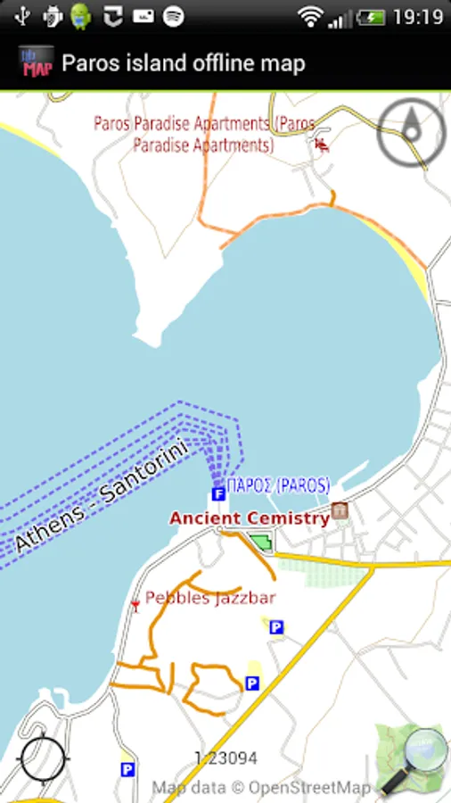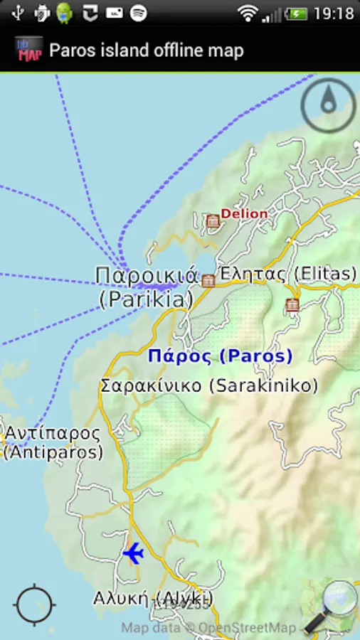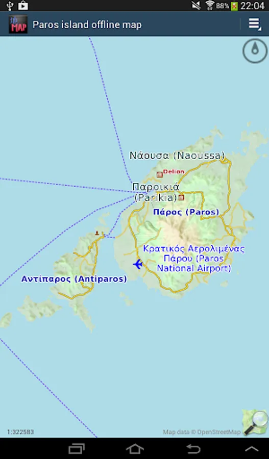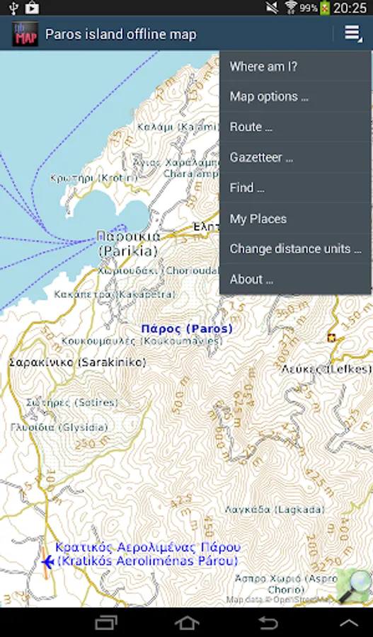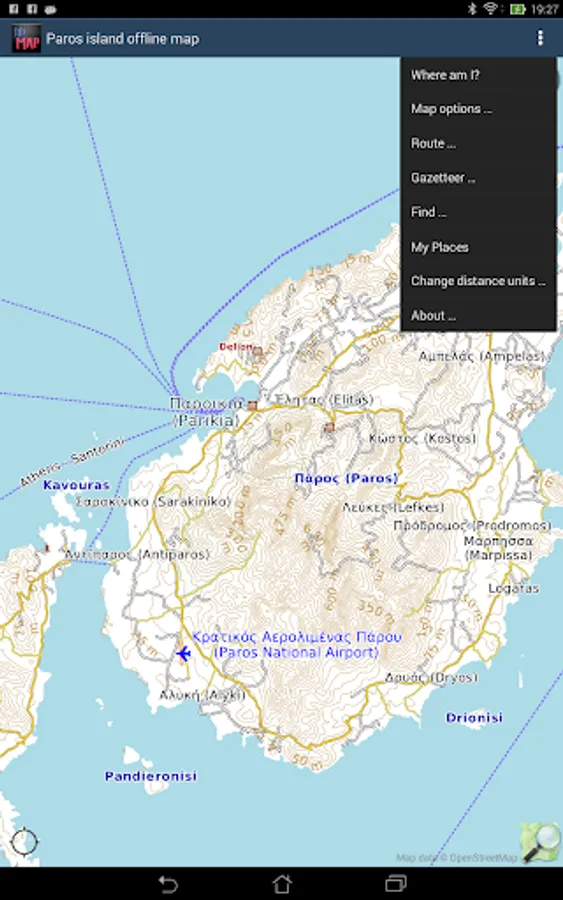 IMPORTANT NOTE: OpenStreetMap, http://www.openstreetmap.org, does not yet have full coverage of Paros, so this map may not be for you. The main island roads, airport, ferry terminals, villages, place names are there. BUT: many smaller roads/tracks are missing, there are very few street names, few places to see locations and there are not many general amenities such as hotels to put in our gazetteer. Caveat emptor! You can help improve it by becoming an OpenStreetMap contributor. We publish free app updates every few months with new information. If you want one faster, just email our developer email address and we will do it as soon as we can.