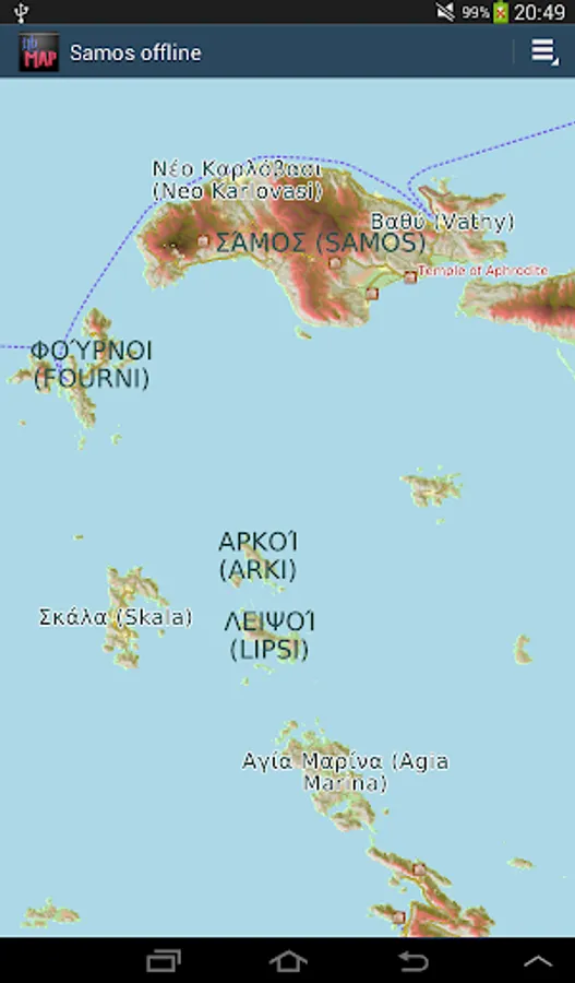 Offline map of the Greek islands of Samos, Ikaria and smaller islands of Fourni, Patmos, Arki, Lipsi, Lerosi, Kalymnos, Agia Marina, Skala, Thymena for tourist and business visitors.