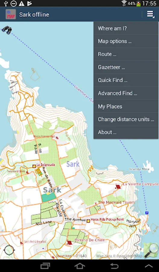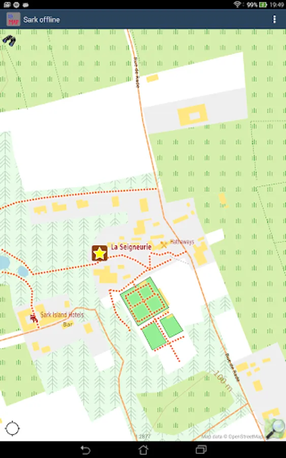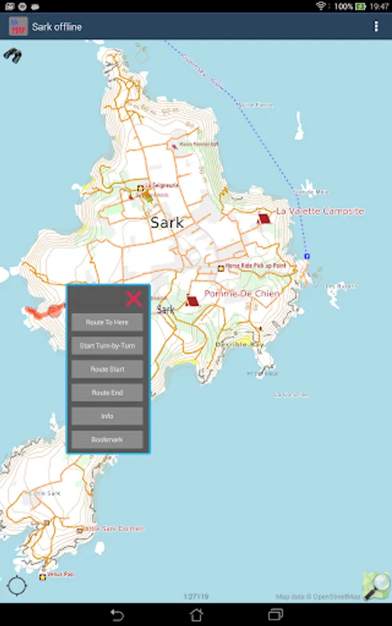 Offline map of the Channel Islands island of Sark for tourist & business visitors. Download before you go and avoid expensive roaming charges. The map runs completely on your device; map, routing, search, bookmark, everything. It does not use your data connection at all. Switch your phone function off if you want to!