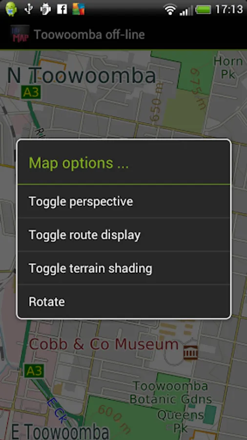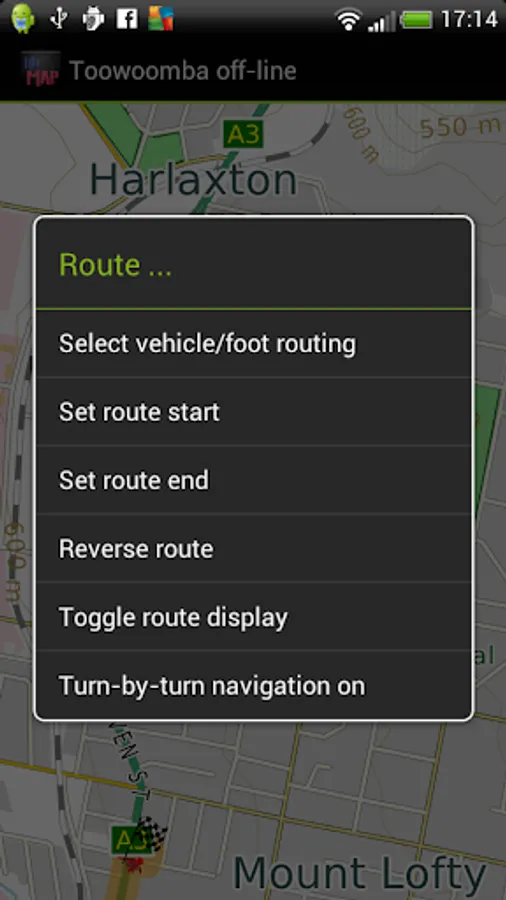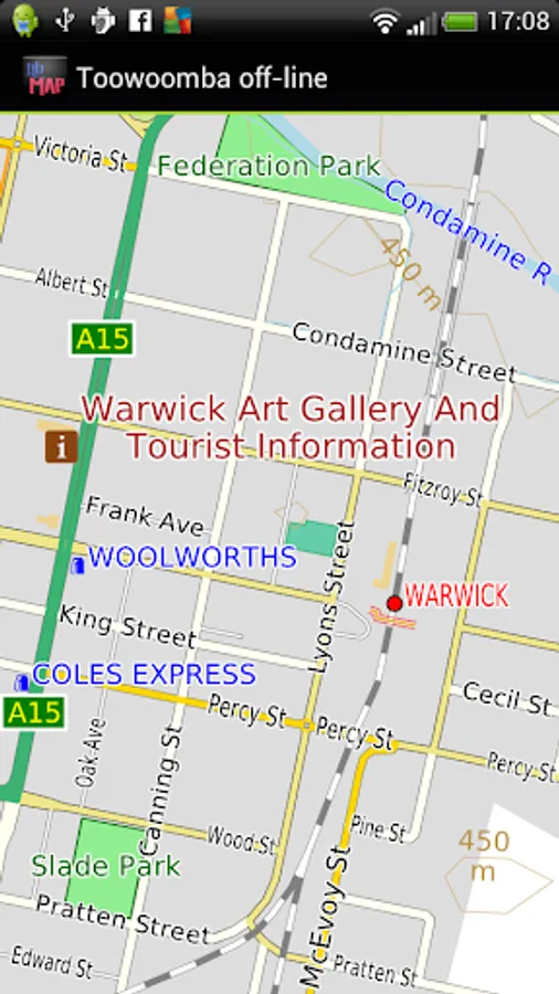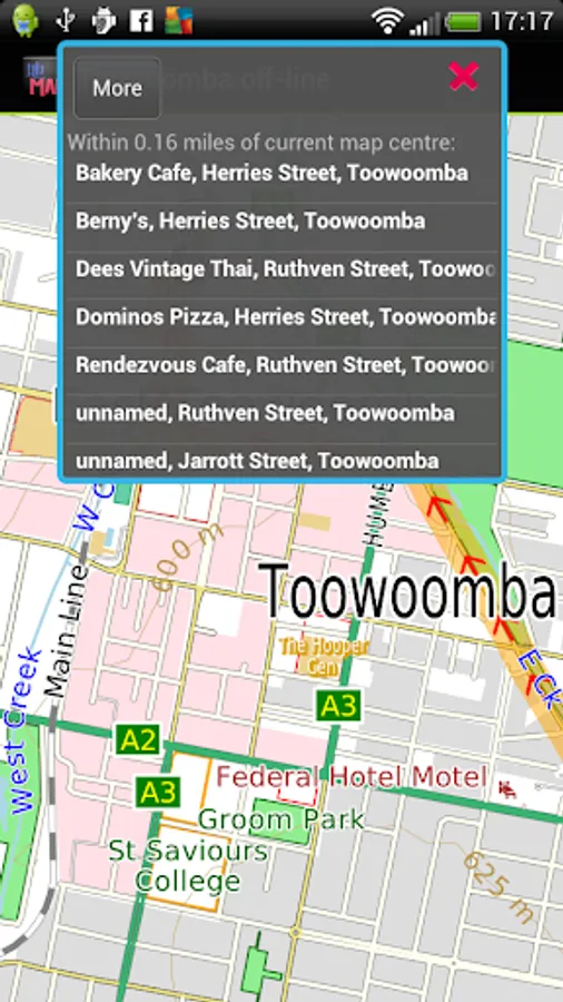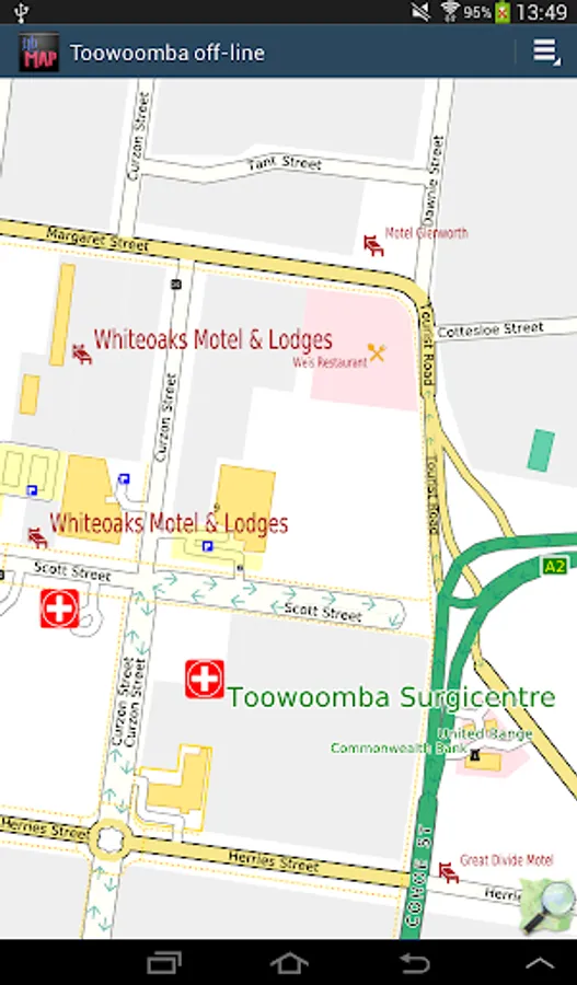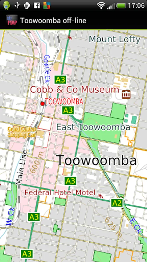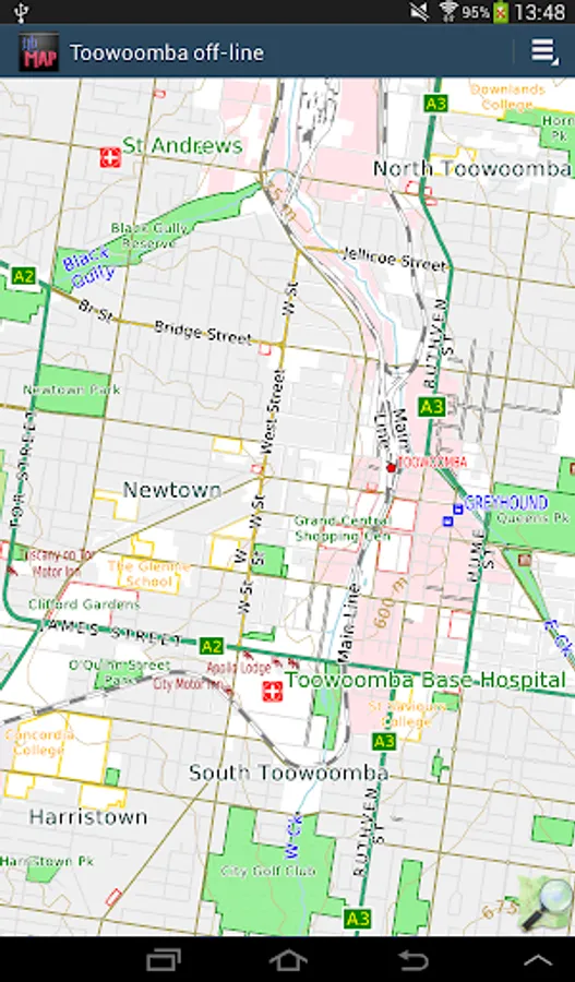 Offline map of Toowoomba, Queensland, Australia and surrounding areas for business and tourist visitors. Download before you go or using your hotel's Wi-Fi and avoid expensive roaming charges. The map runs completely on your device; map display, routing, searching, everything. It does not use your data connection at all. Switch your phone function off if you want to.