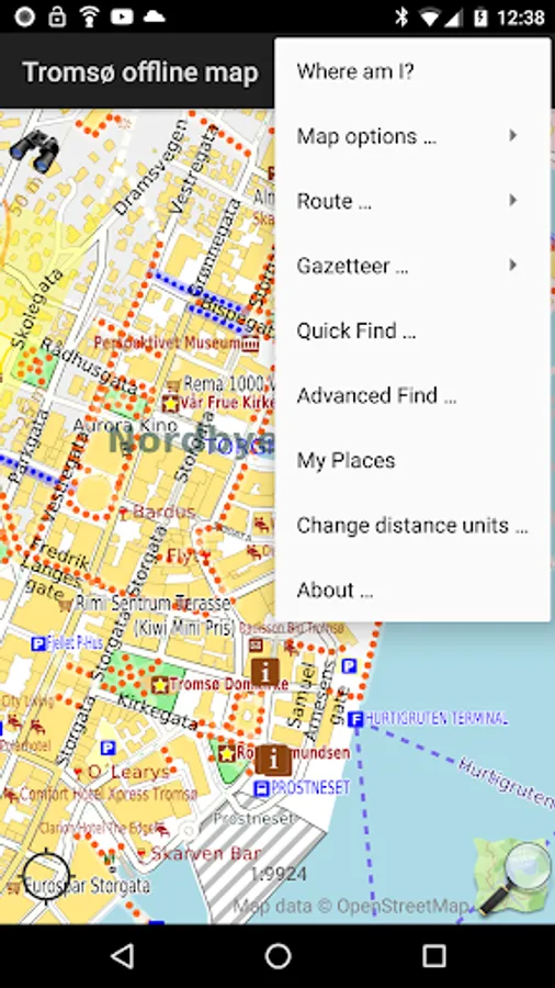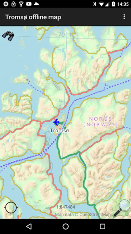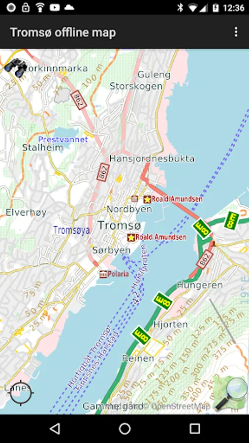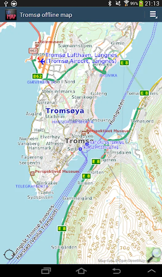 Offline map of Tromsø, (Tromso), Norway, for tourist & business visitors. Download before you go and avoid expensive roaming charges. The map runs completely on your device; display, routing, search, bookmark, everything. It does not use your data connection at all. Switch your phone function off if you want to!