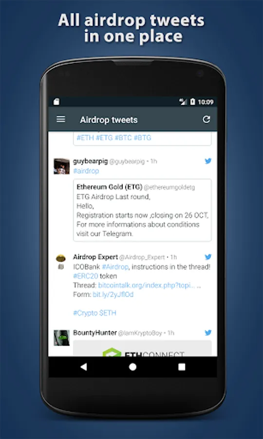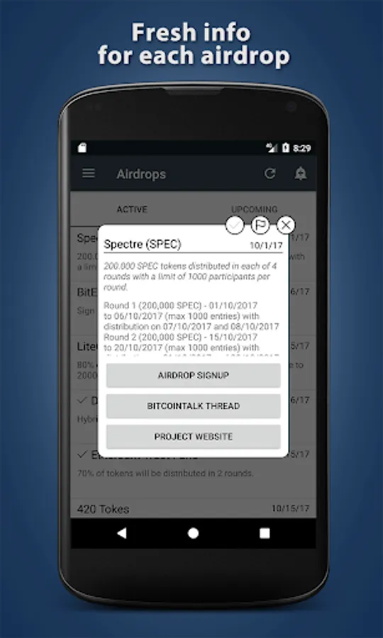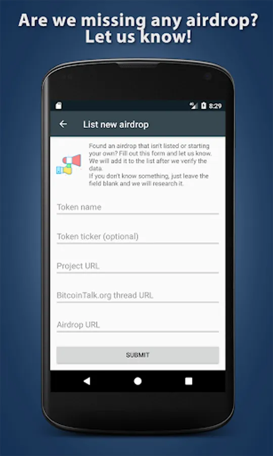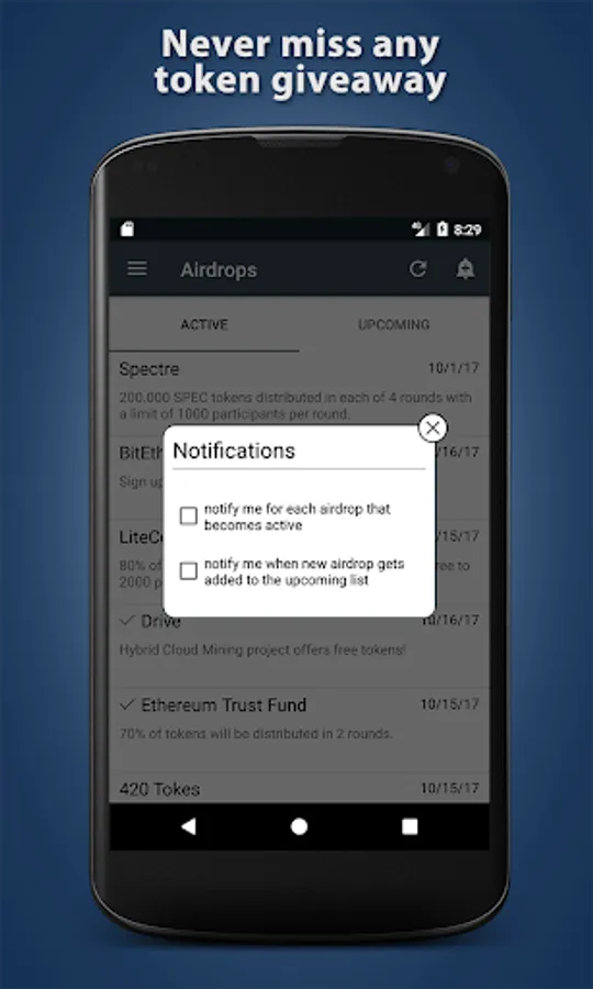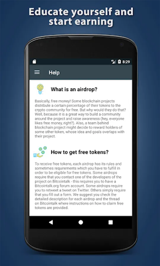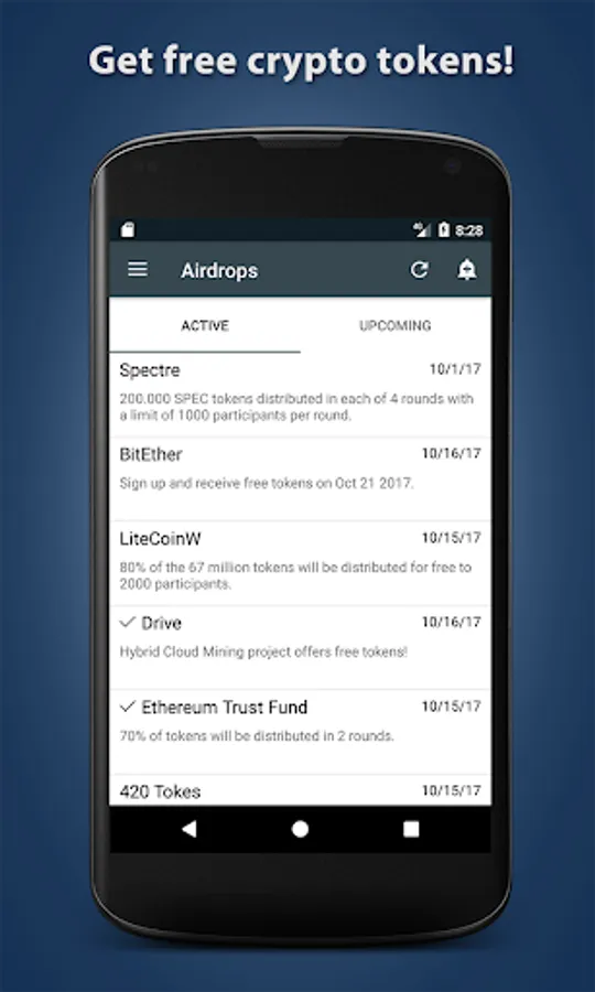 Up until now, there was no central point where you could see all of the active and upcoming cryptocurrency giveaways - Airdrops app is changing that. We curate the list of airdrops by hand and have a team of people on the lookout for newly launched airdrops every day. We provide brief and concise descriptions and relevant links for each airdrop. You can enable the notifications and never miss another airdrop again. We are still in early stage and our future development will bring you even more earnings - download the app and stay tuned!