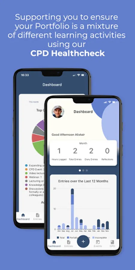The CPDme app Dashboard screen provides you with useful infographics of your CPD entries and the ability to book onto great, upcoming CPD events and webinars that will contribute to your continued development.