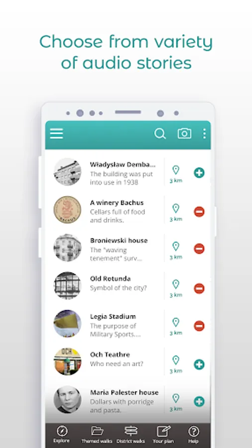 Listen to professional guided audio records about the places you pass on your way home from work, or during your sightseeing walks, and learn your city again from scratch.