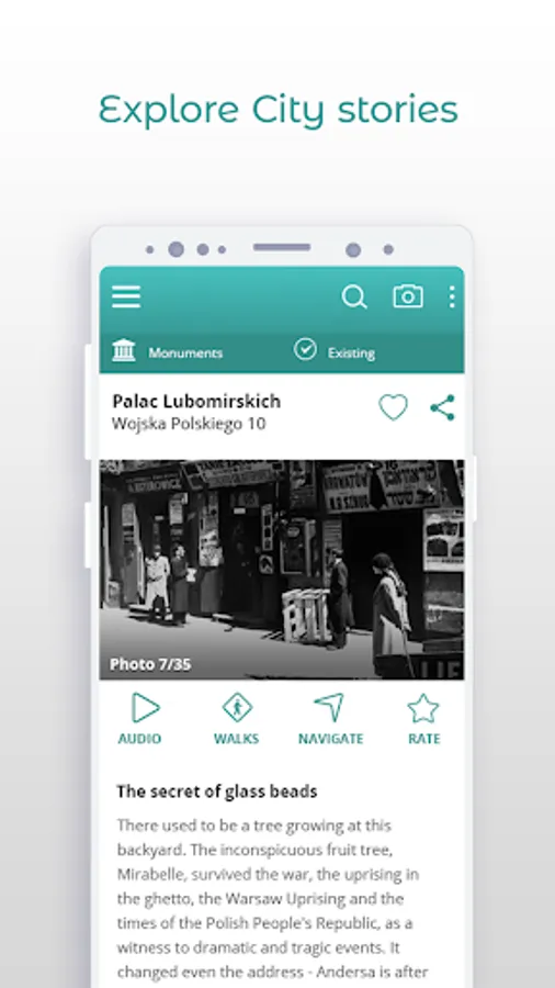 Thanks to our City Talks application, you can feel at home in a completely unknown place or rediscover the city which you live in since birth. Wandering through the streets, parks, squares with City Talks is not only getting to know the history of monuments, famous tourist points, but above all the houses, tenements, blocks in which ordinary people lived.