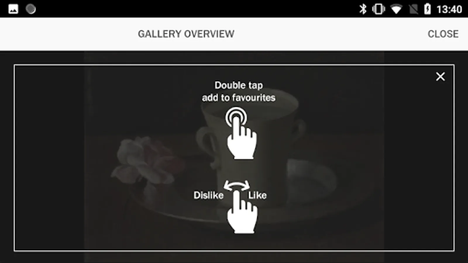 To capture a quick snapshot of your likes and dislikes, scroll through the selection of paintings from the collection and highlight you preferences, by sliding a painting to the left for “No, I don’t like it” or to the right for “Yes, I like it”. You can also double tap on the painting to add it to your favourites