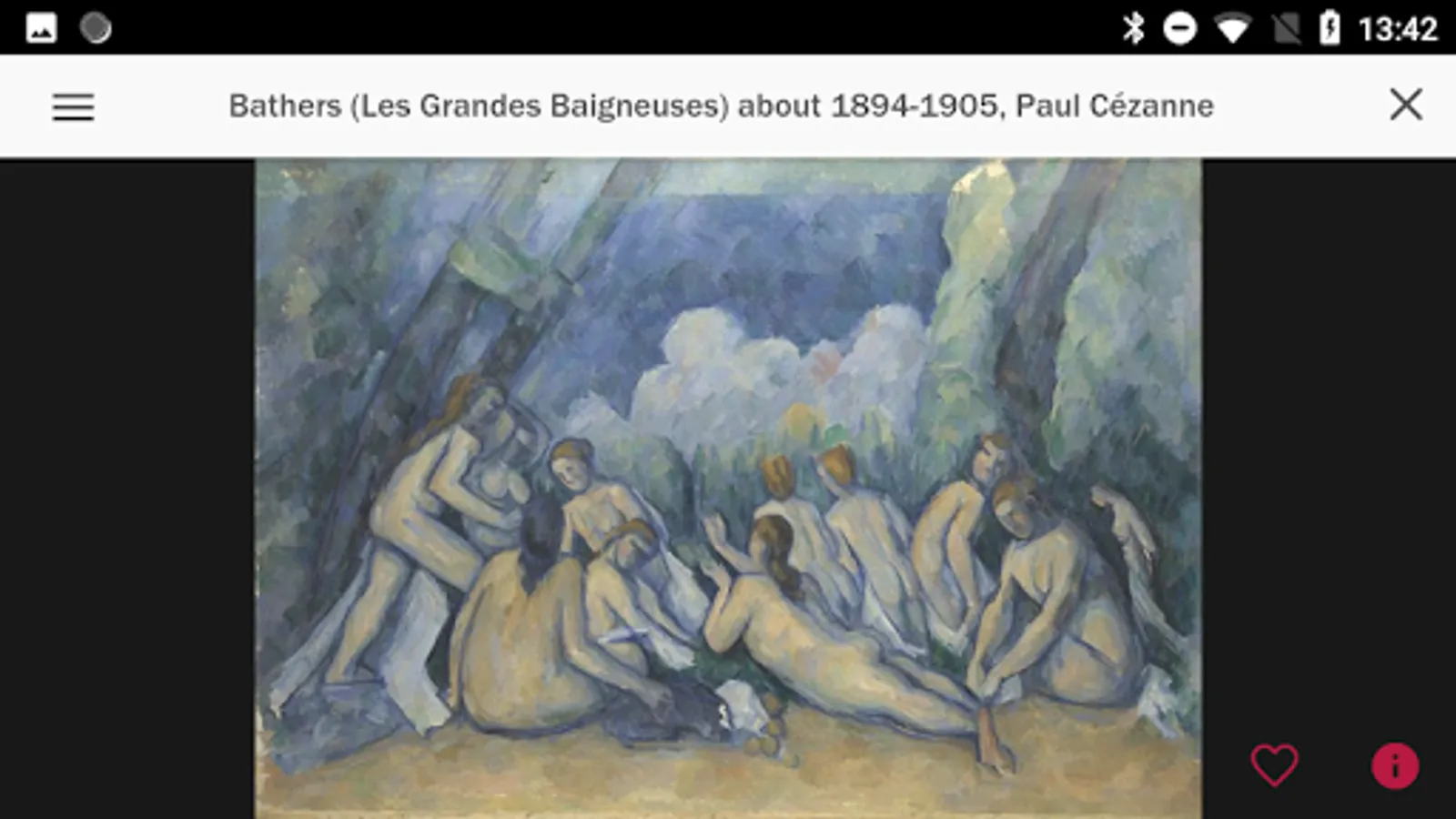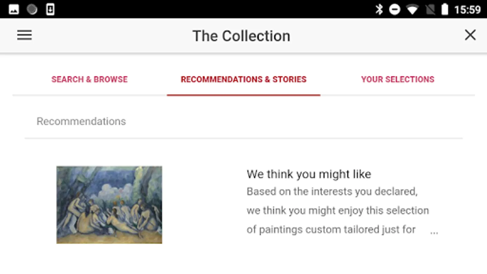 The search box allows you to find paintings, artists and rooms related to the term you type. This is also the place to browse the app recommendations and available stories as well as your selections of favourites, liked and disliked paintings