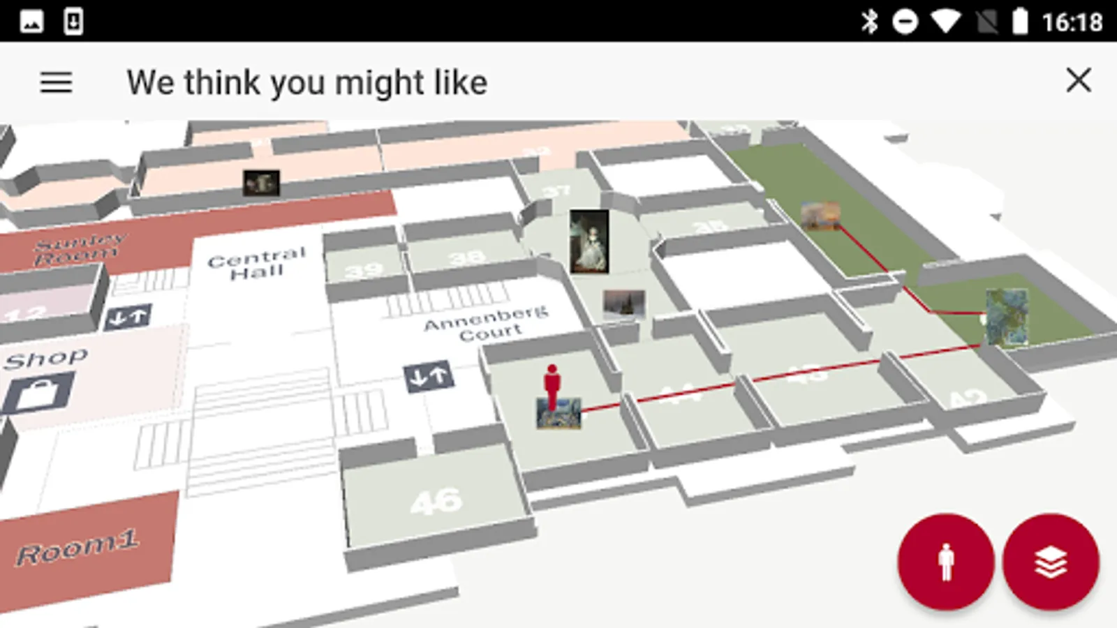 The digital map allows you to explore and navigate your way through the National Gallery, highlighting recommended paintings, selected routes and pin pointing your location. The app will pick up your location automatically once you are physically in the Building. On the pop up window click on enter and tap on the thumbnails to learn more about individual paintings.