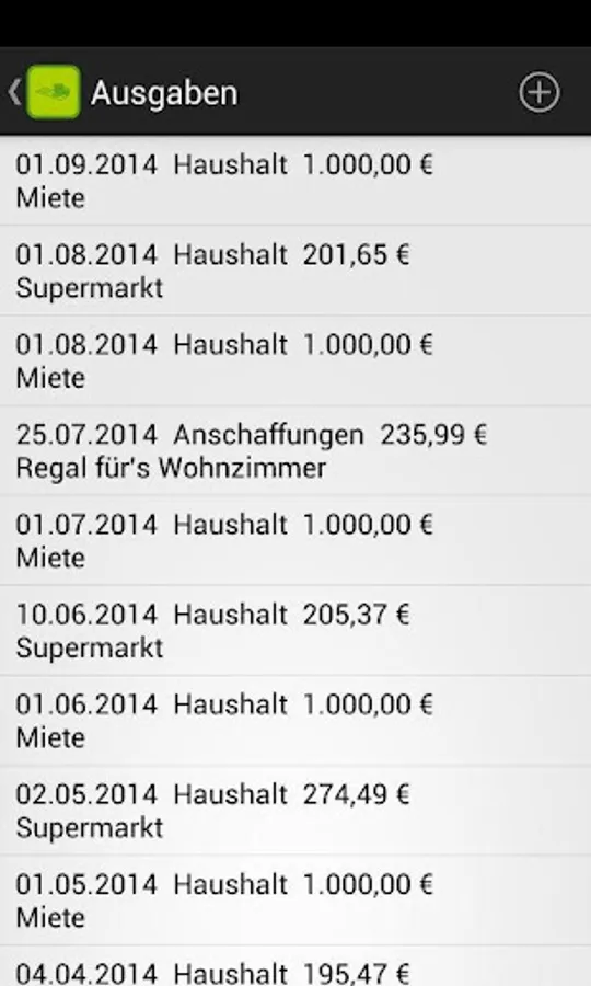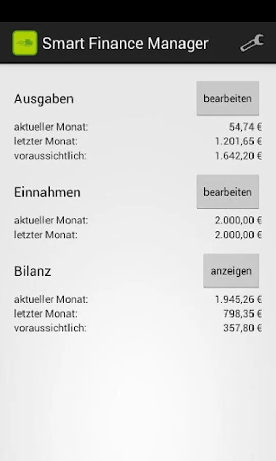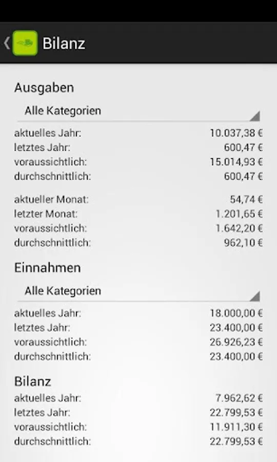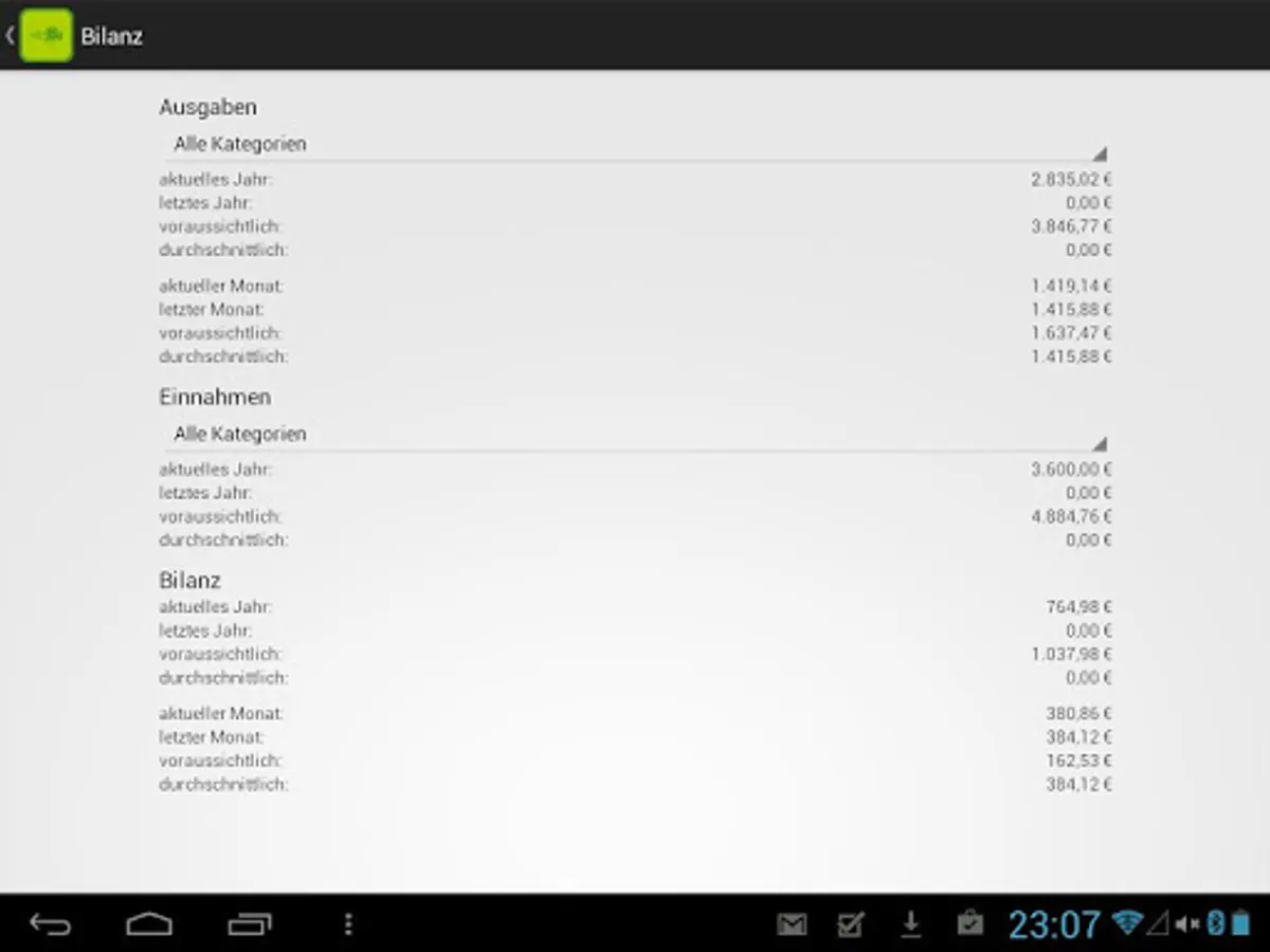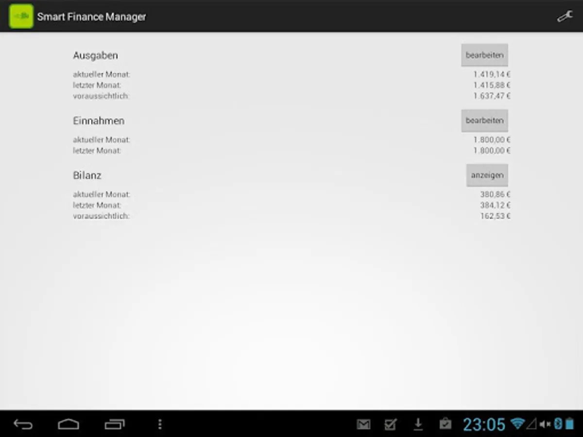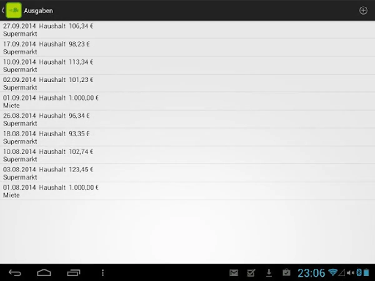 It was deliberately overloaded to display the budgets in this application. However, the current financial status is already visible on the homepage. At a glance you can see how much money you have available and get a forecast about the future course of the month. Revenue and expenditure are entered quickly by clearly designed dialogs.