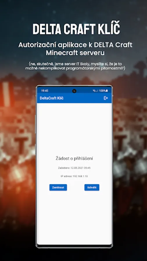 DeltaCraft Klíč is a lightweight app that allows you to securely log in to your favourite Minecraft server without any complicated password.