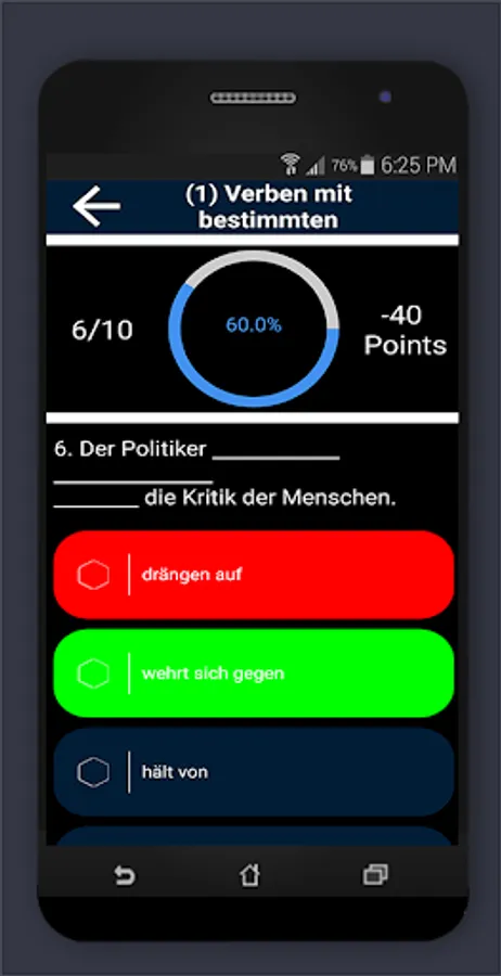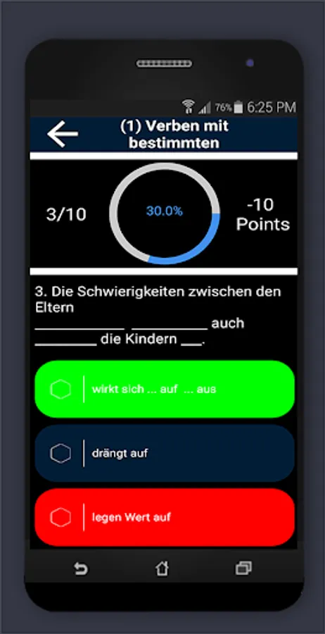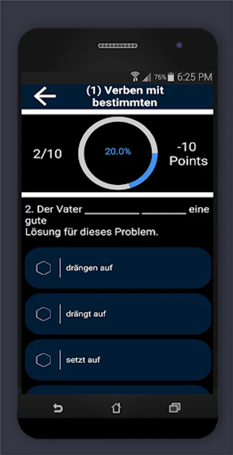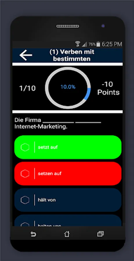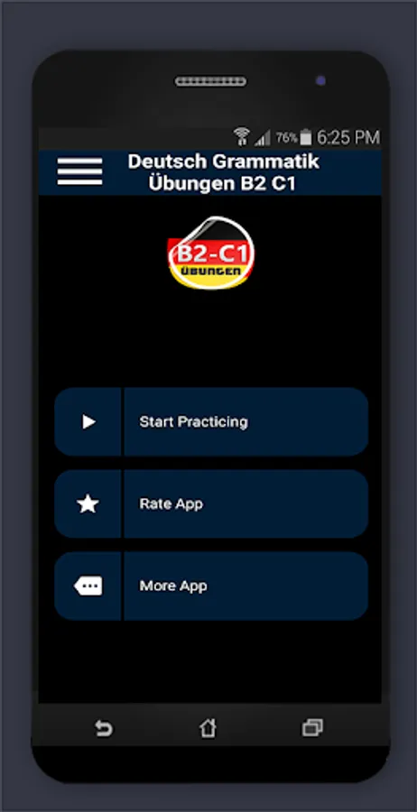Which languages does this app support "German grammar exercises B2 C1"? Depending on the language setting of the smartphone, the menu is in German or English. The multiple-choice questions are of course in German.