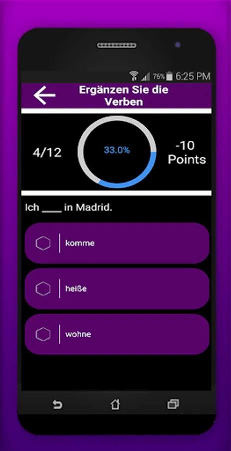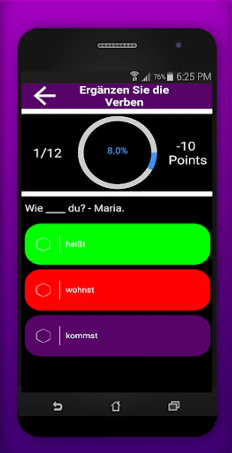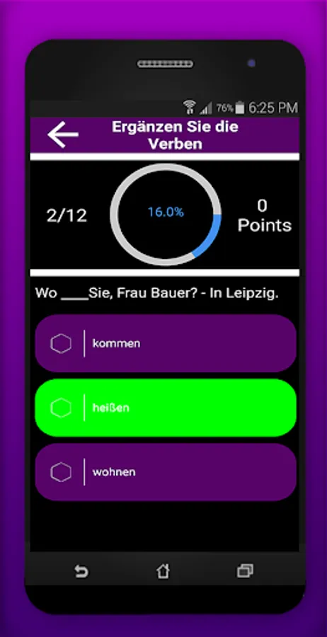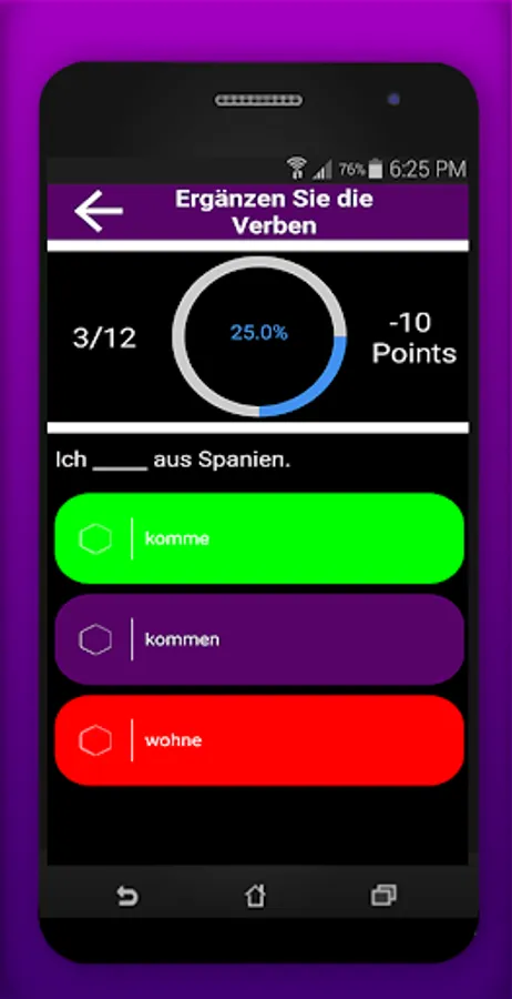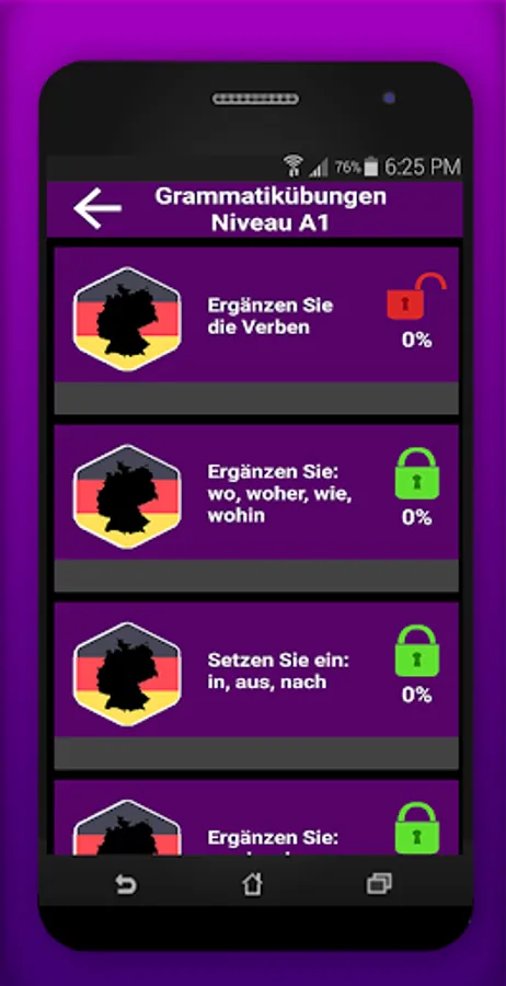 Welcome to the german course Grammatiktraining A1 by the app " grammar exercises level A1 ". You can choose from 18 grammatical topics. It's best to start the course with the grammar test. Use this test to find out which topics are important to you. You can work 10 exercises during the course.
