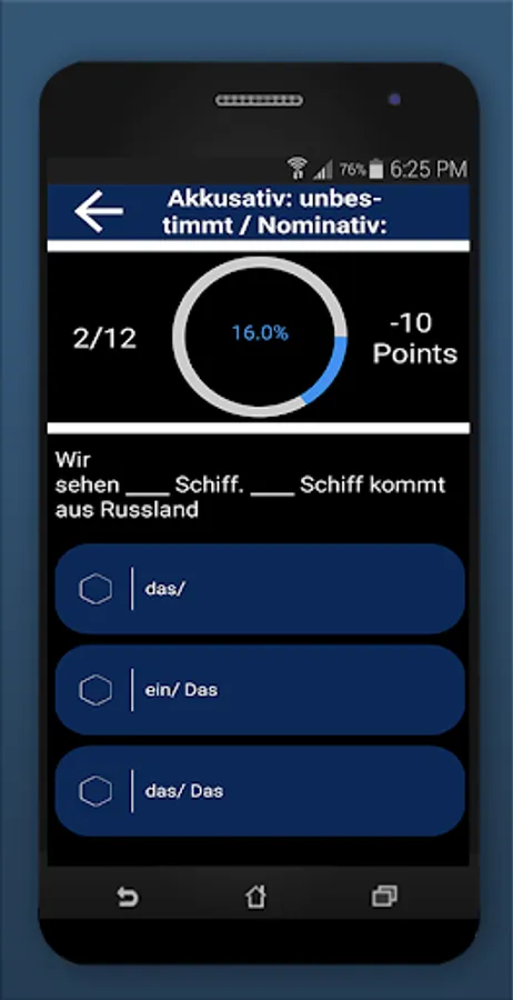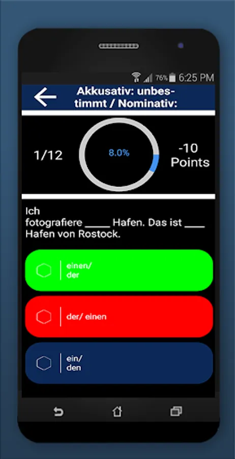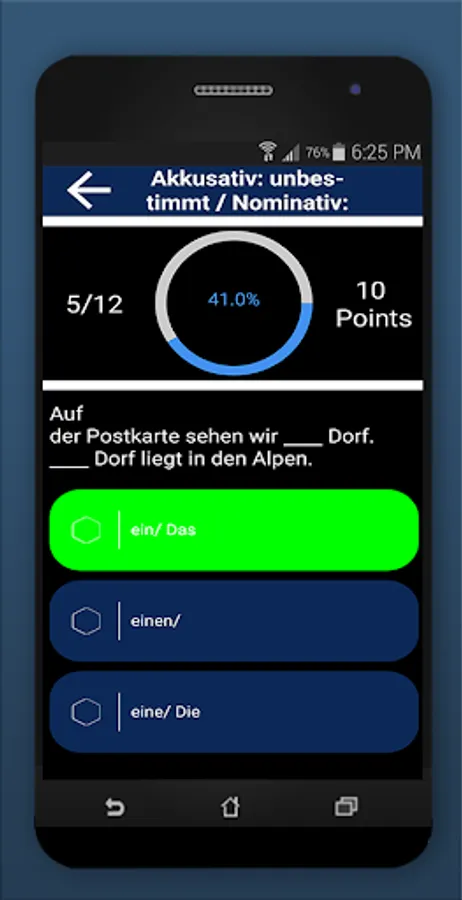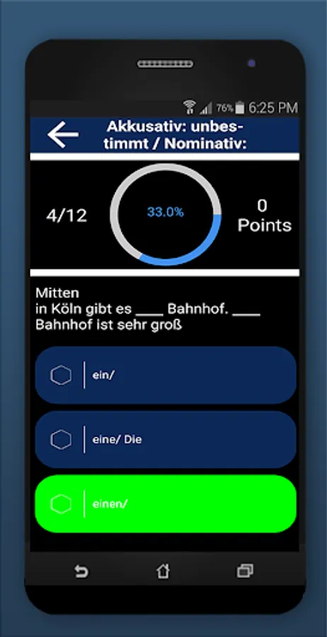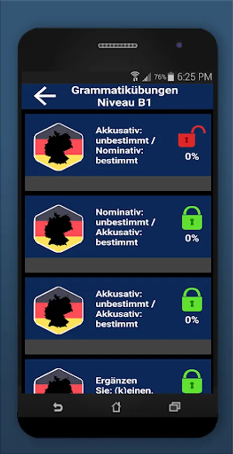 Welcome to the german course Grammatiktraining B1 through the app " grammar exercises level B1 ". You can choose from 18 grammatical topics. It's best to start the course with the grammar test. Use this test to find out which topics are important to you. You can work 10 exercises during the course.