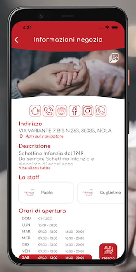 Display of all our contacts: telephone, address, opening hours and closing days.