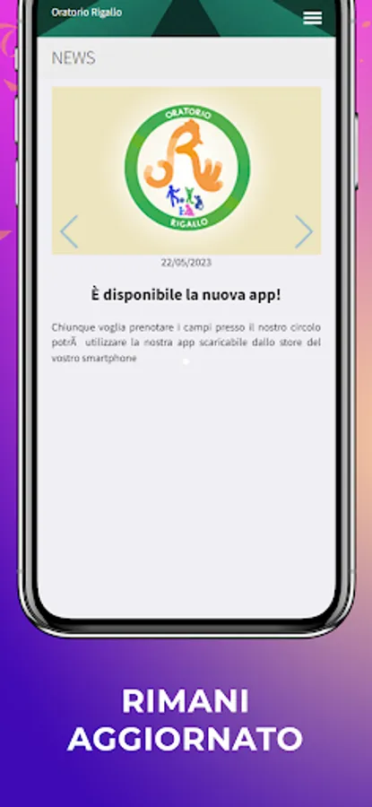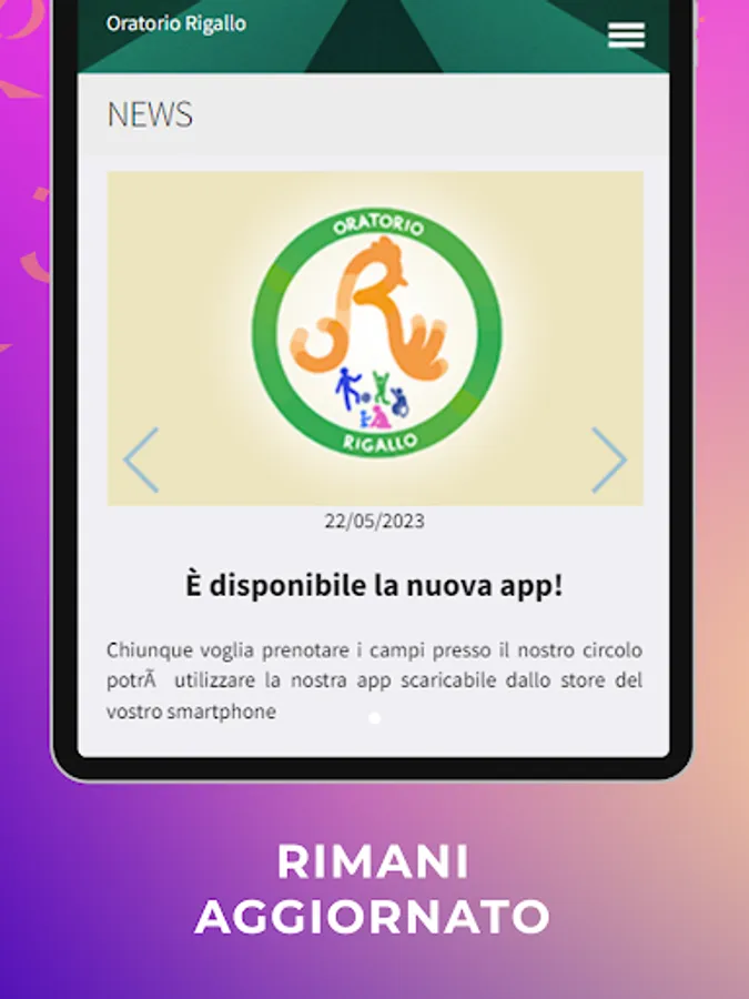 Application dedicated to the Rigallo Oratory with which it is possible to see general information, news regarding the life and activities managed and book the available resources.
