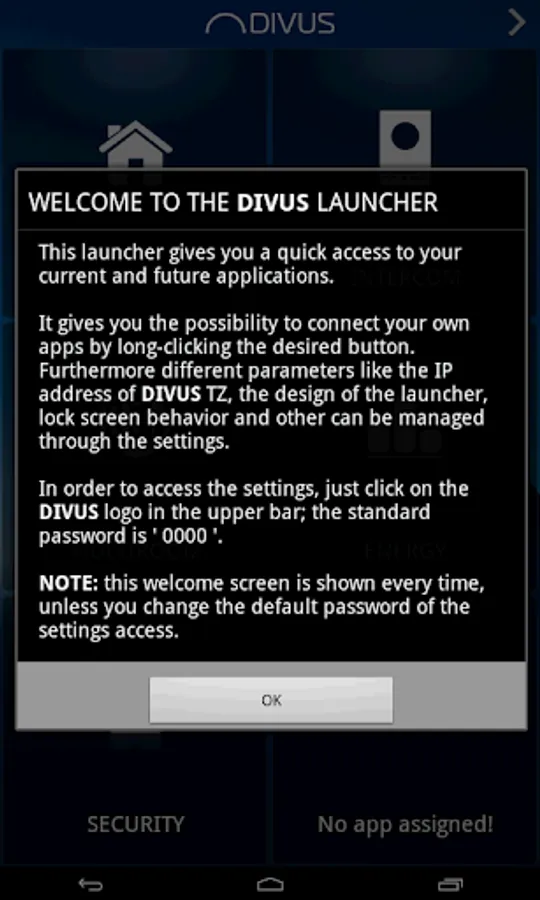 If the app is started for the first time (e.g. at delivery of DIVUS TOUCHZONE), a welcome screen with some useful information will be shown. Furthermore, additional information about the usage of the app can be found in the user manual of DIVUS TOUCHZONE on the DIVUS homepage.