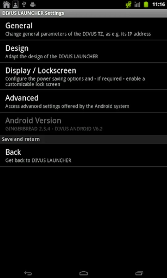 The DIVUS LAUNCHER app shows a simple grid of 6 fields that permit a quick access to the most important functions / apps. Naturally it is possible to create more than one launcher page, with the possibility to change between them using a swipe gesture. Furthermore the app offers also a series of settings which should make easier the configuration of DIVUS TOUCHZONE.