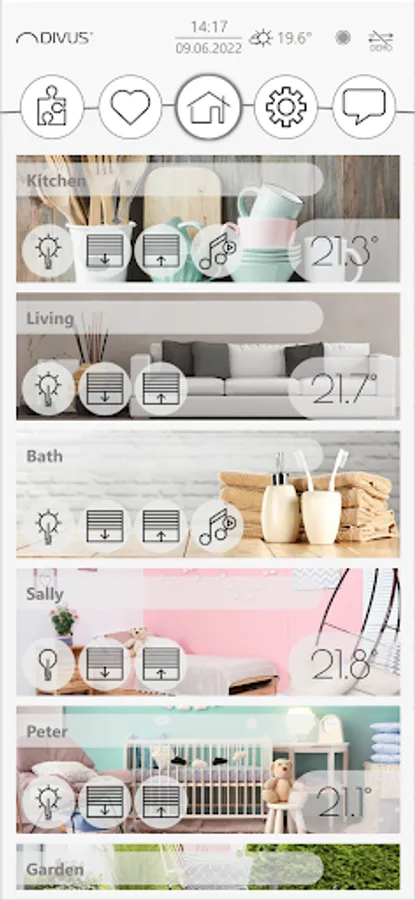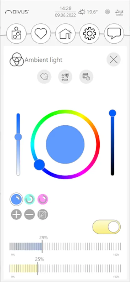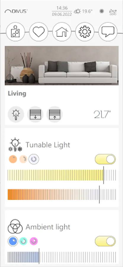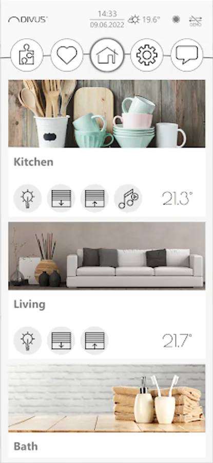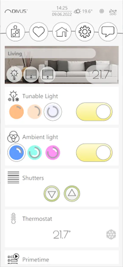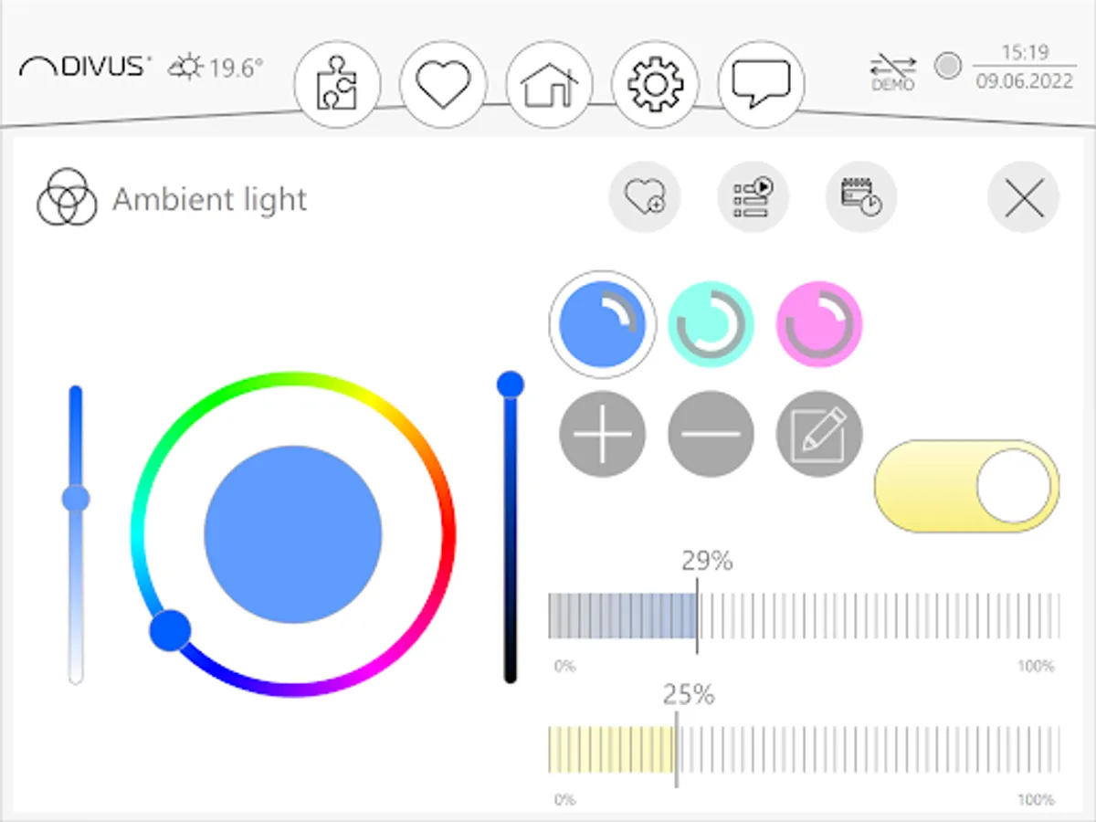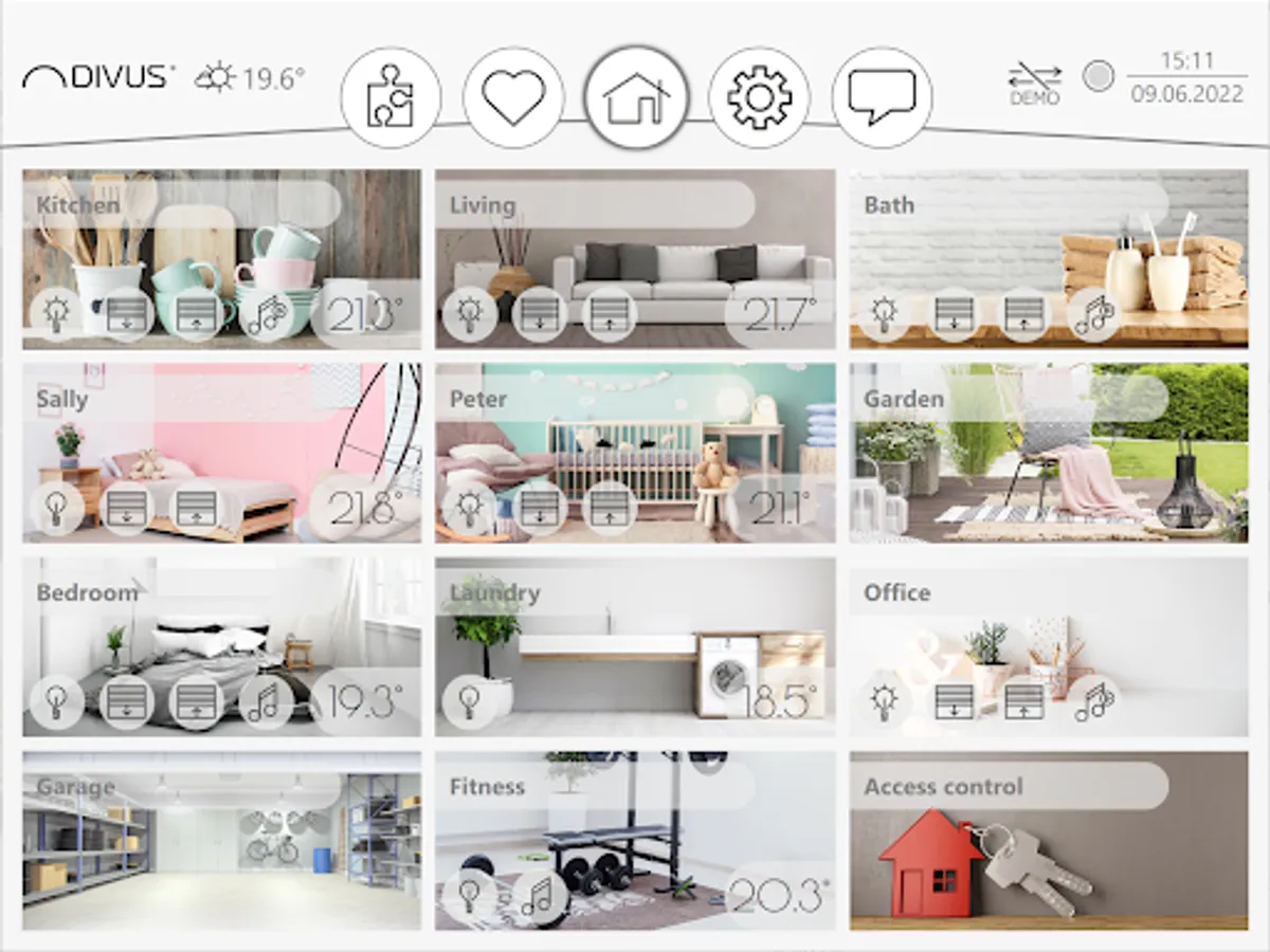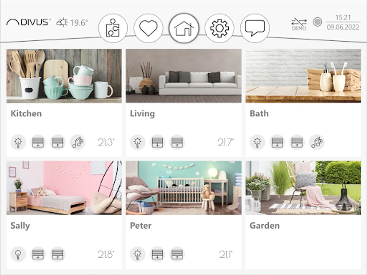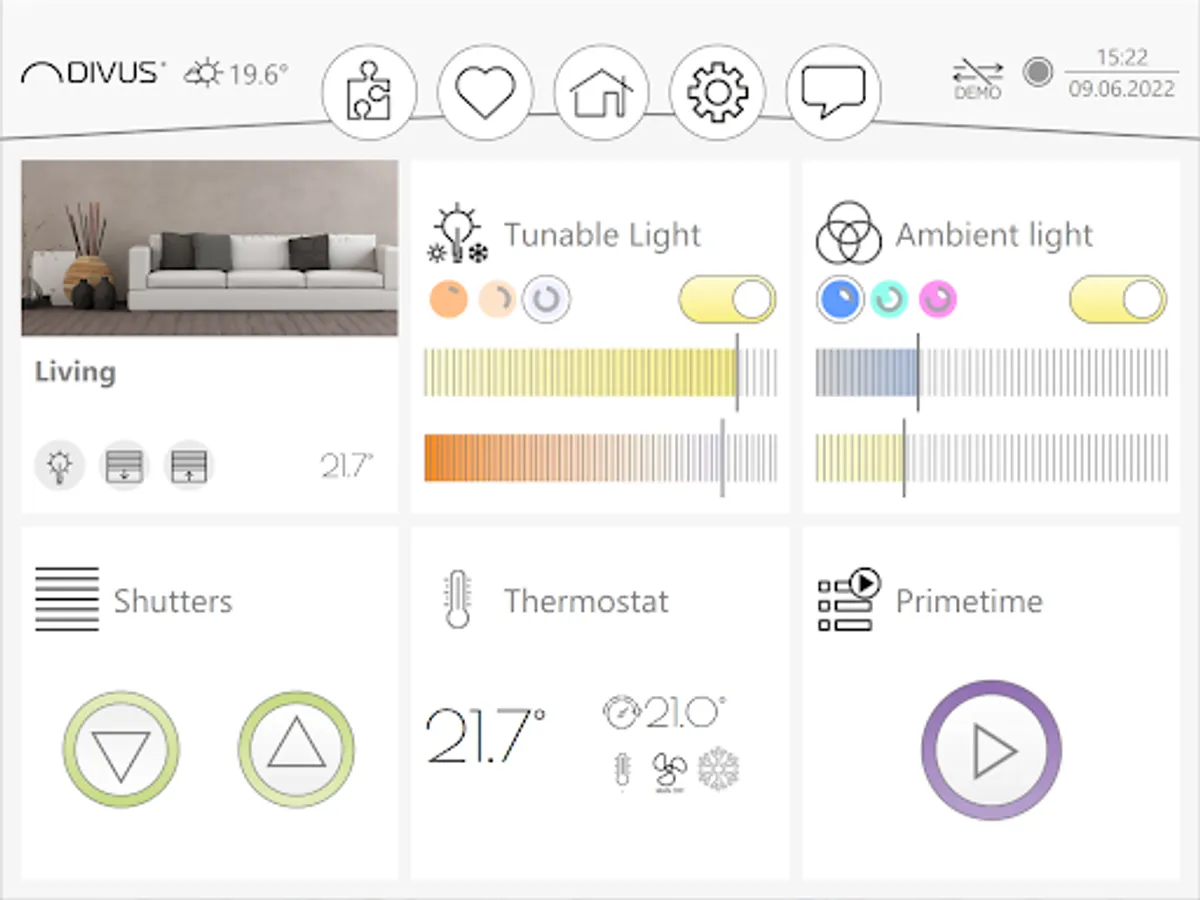 The visualization user interface DIVUS VISION convinces with its simplicity in the implementation by the system integrator and control by the customer. Lights, shading, temperature, music, alarms can be controlled via the panel. In addition, smart devices can be integrated into the visualization.