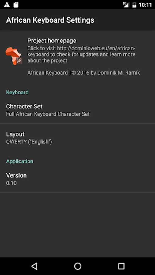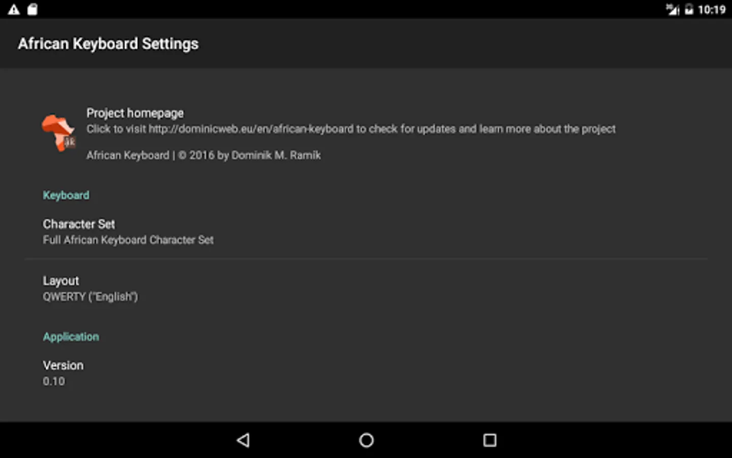 The African Keyboard app is an Android keyboard implementing special characters of African languages that use Latin-based alphabets. Its goal is to give users means of writing their native languages and as such to promote the preservation and growth of those languages and their cultures.
