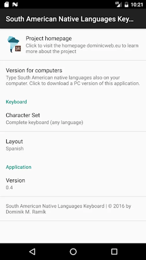 The South American Native Languages Keyboard app is an Android keyboard implementing special characters of South American native languages that use Latin-based alphabets. Its goal is to give users means of writing their native languages and as such to promote the preservation and growth of those languages and their cultures.