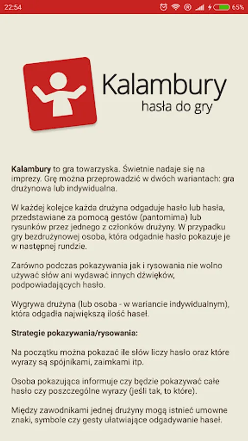 In each round, each team guesses the password or password, presented by gestures (pantomime), or drawings by one of the team members. In the case of the game bezdrużynowej person who guesses the password you show them in the next round.
