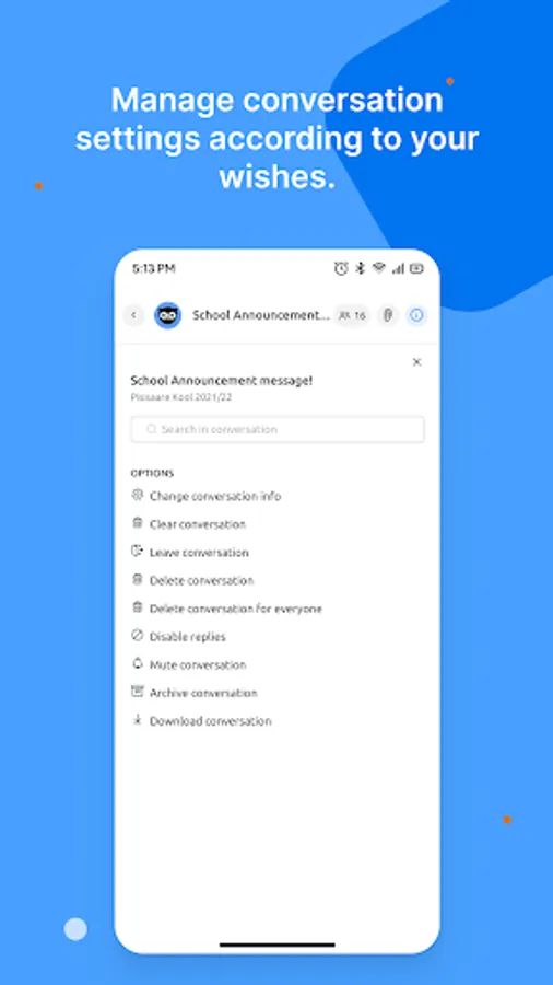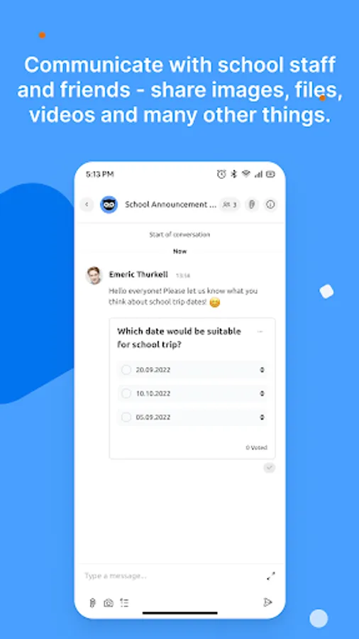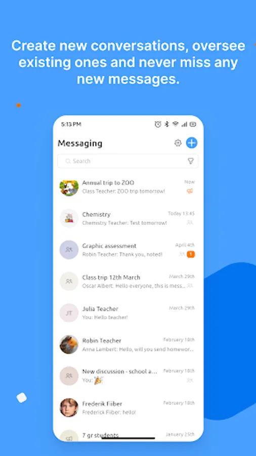Leave email school groups behind and manage all school related conversations in eKool Messaging app. Messaging app for eKool system users provide ability to communicate with eKool users, share files, videos, images and many other things. Create new conversations, oversee existing ones and never miss any new messages. Try out eKool Messaging app!