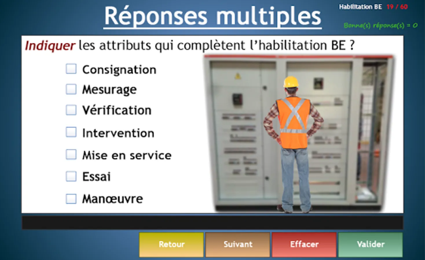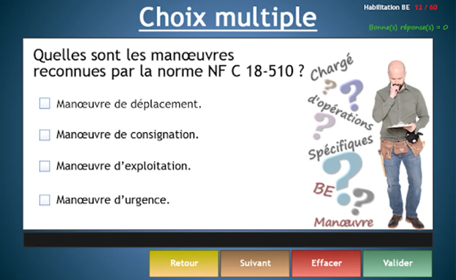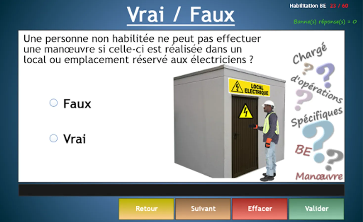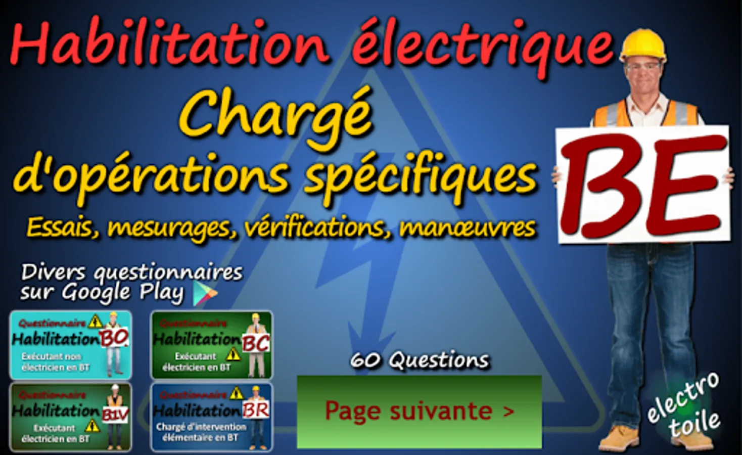 This questionnaire makes it possible to check one's knowledge, to review the key points and to prepare one's recycling for the BE (Specific Low Voltage Operations) electrical qualification for tests, measurements, checks or maneuvers.